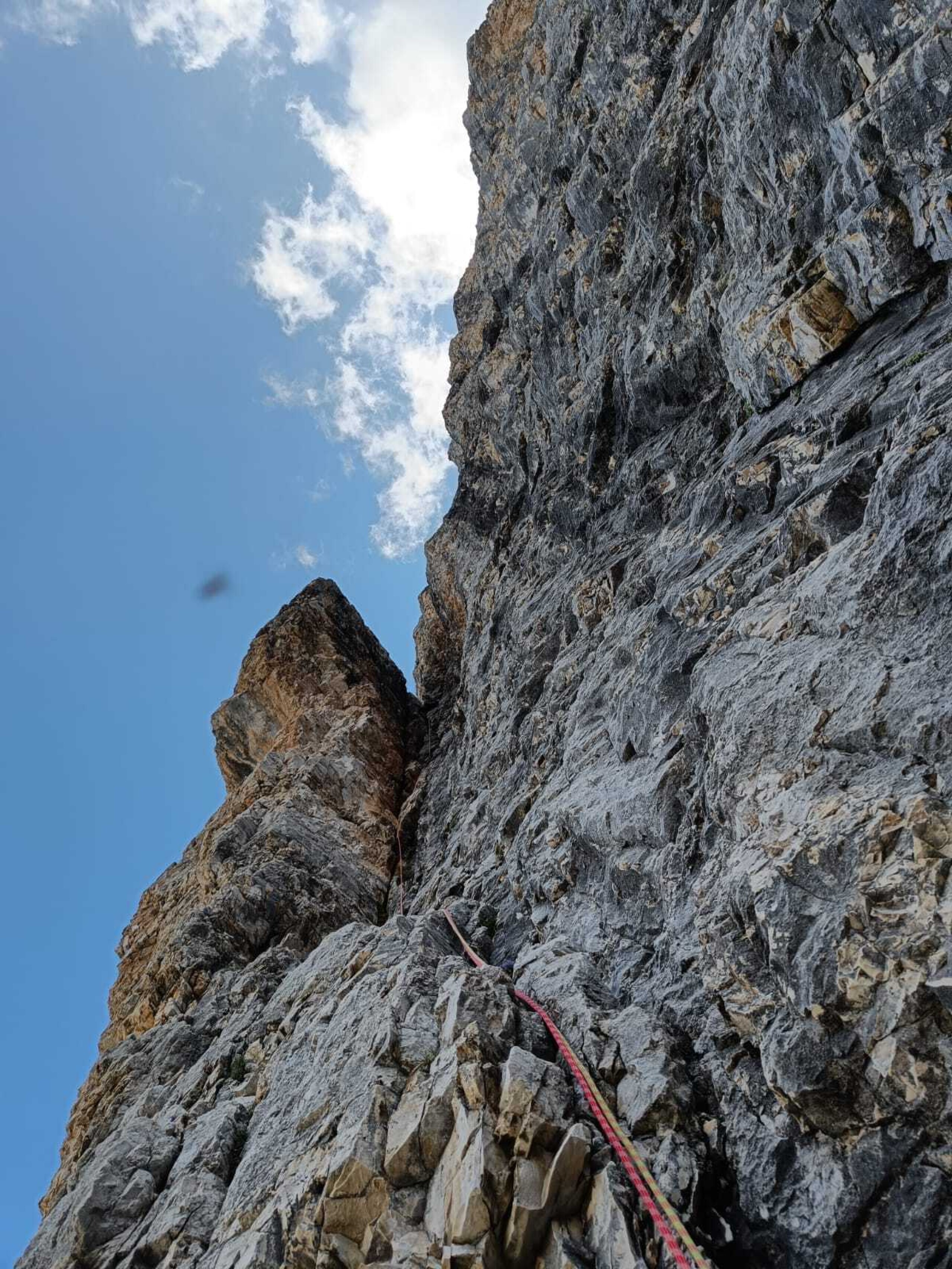 Il grongo ha fatto pochi metri e poi, in direzione della fessura gialla ha cominciato a salire la sua parete ideale, con la corda che penzolava nel vuoto ed il compagno che afferma di essersi sentito solo e di aver voluto chiudere gli occhi prima di vedere lo zaino recuperato dall’alto penzolante nell’aria.
