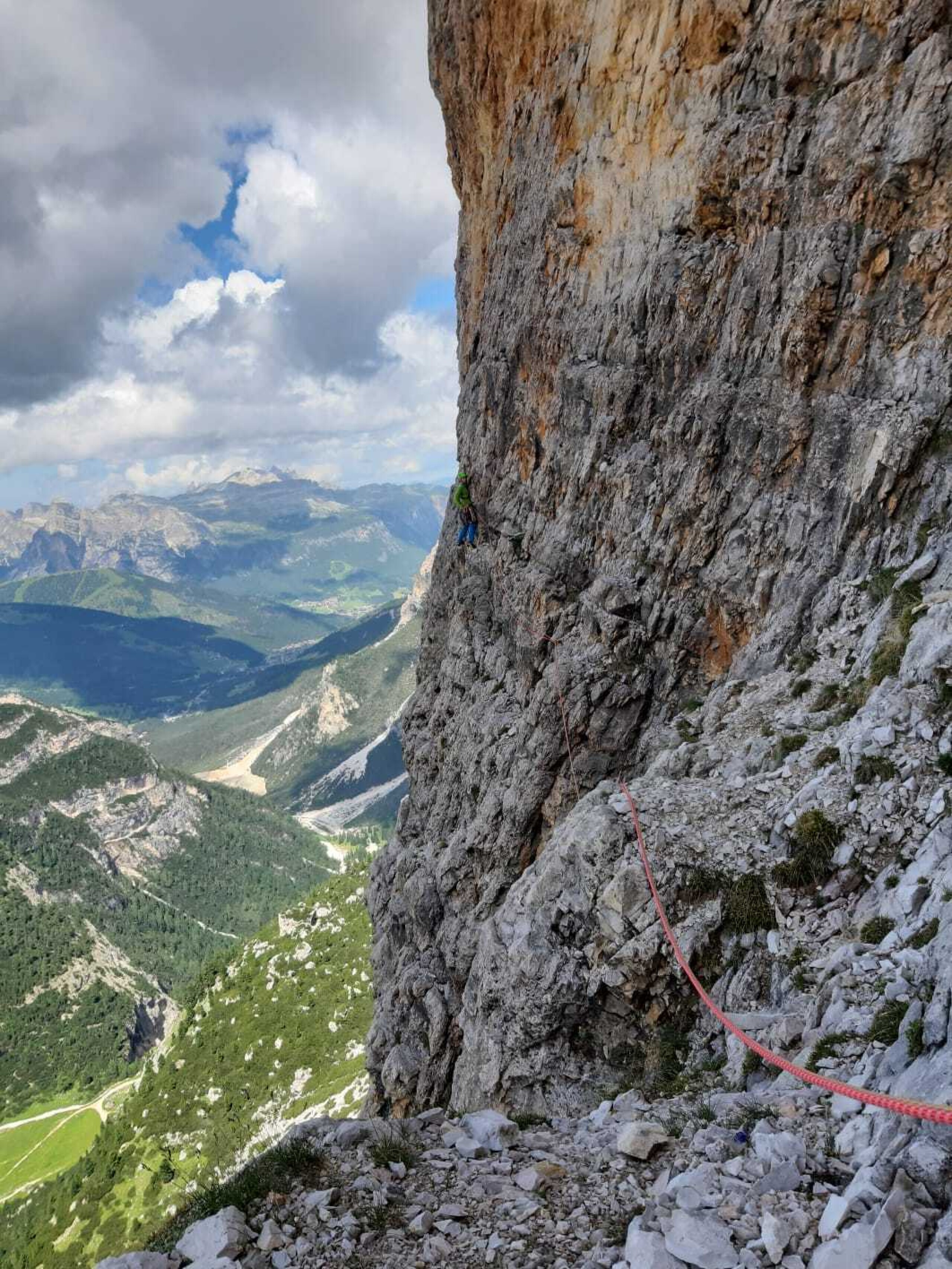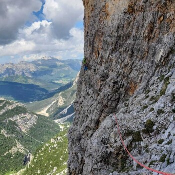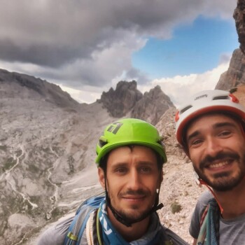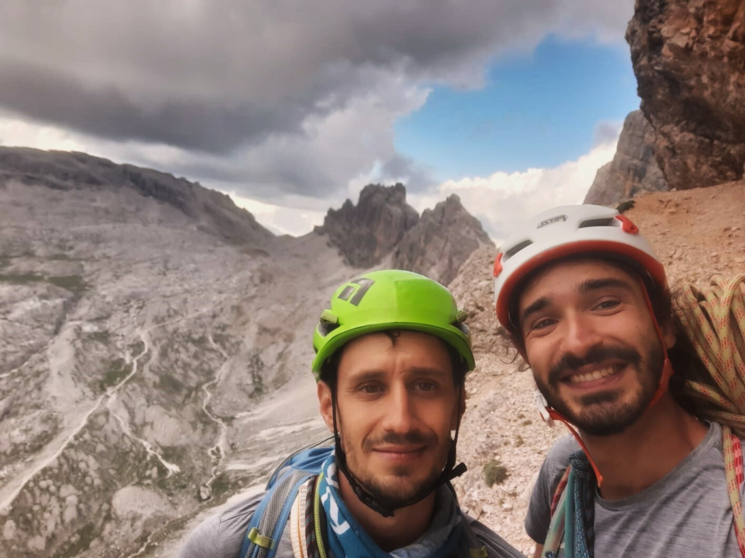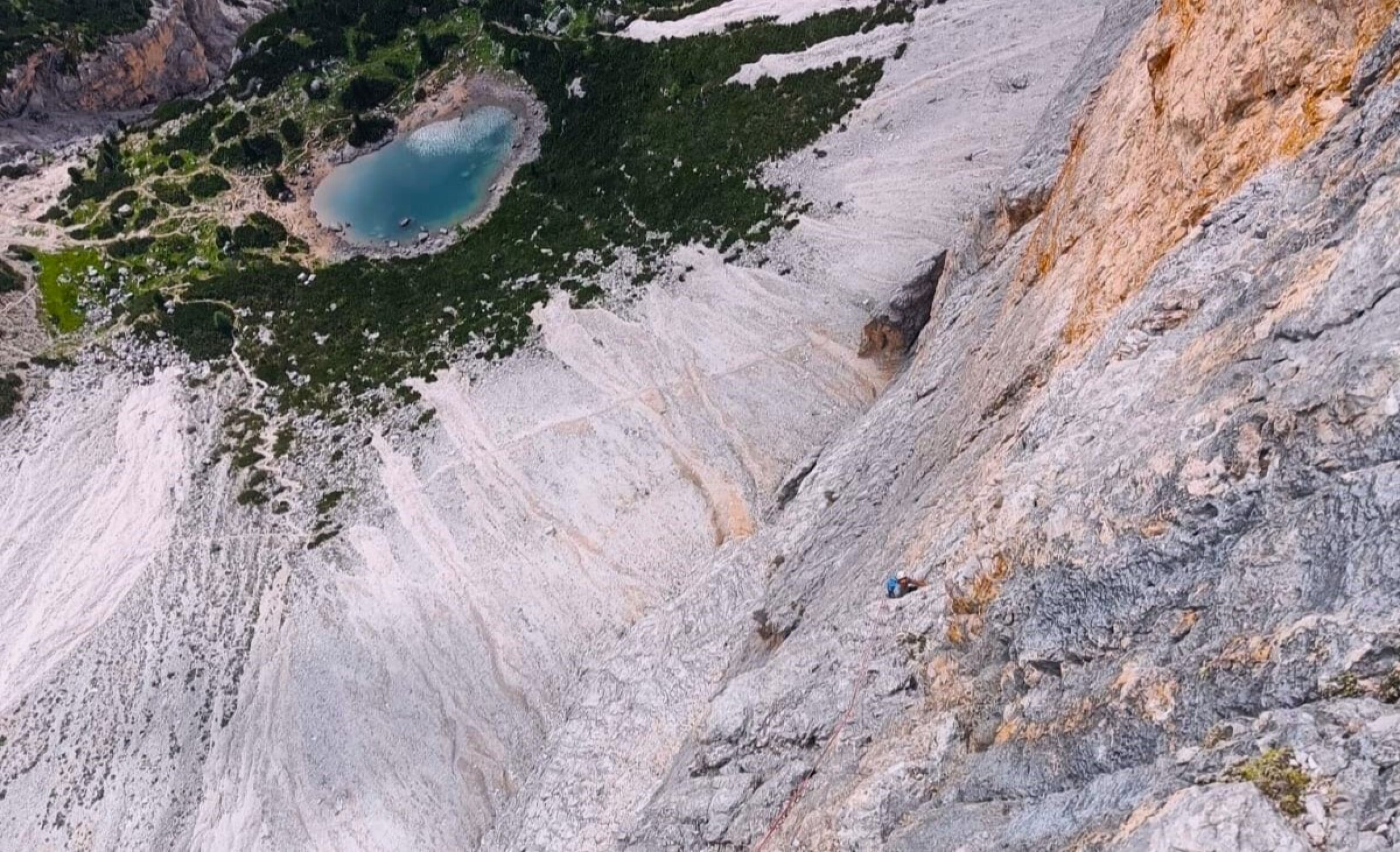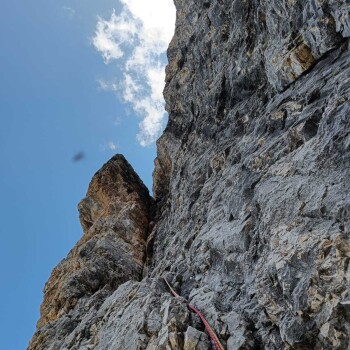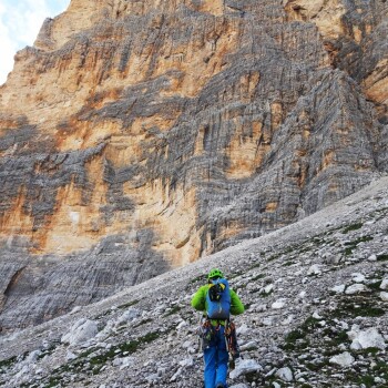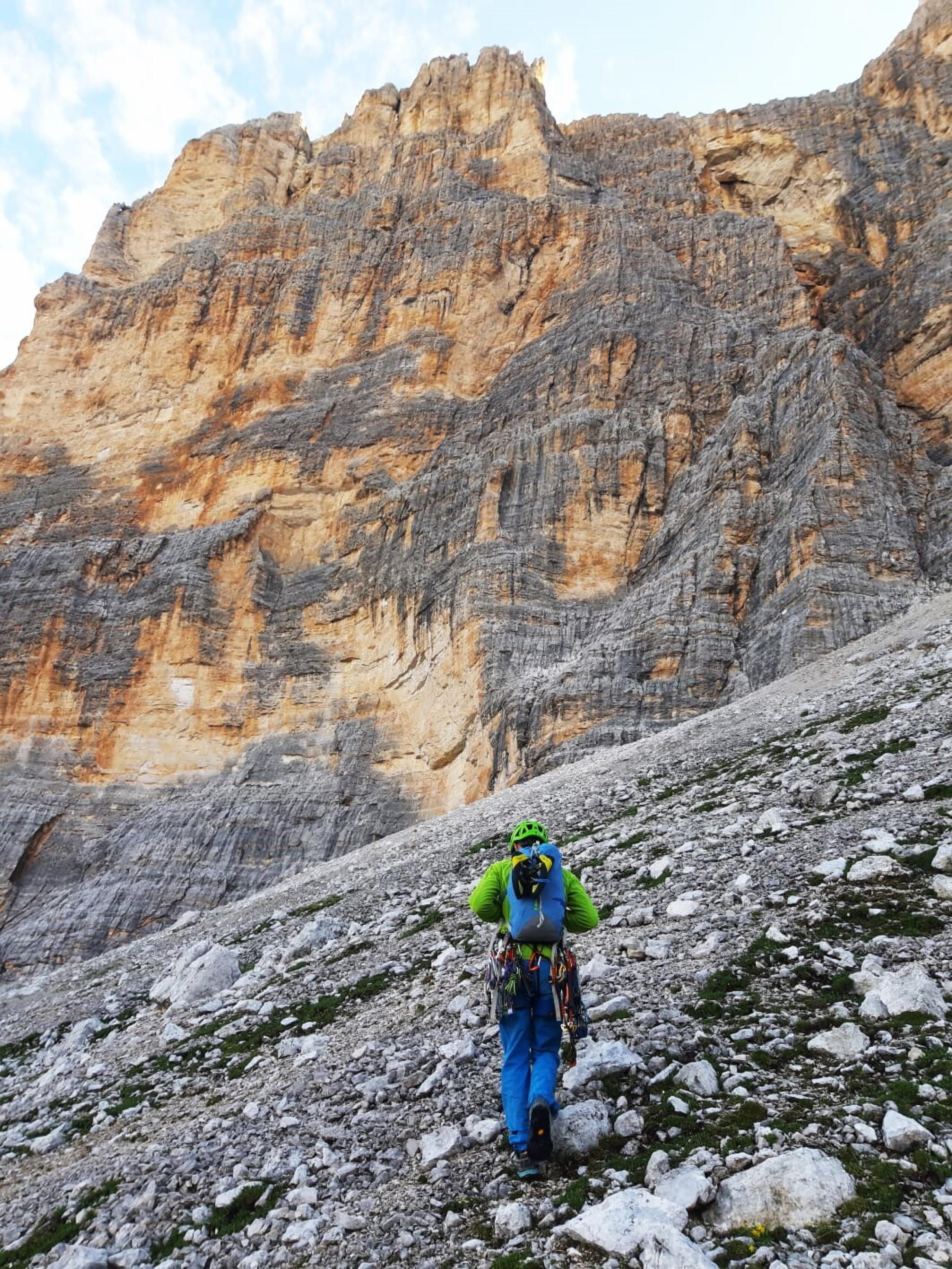 E’ il 30 giugno, sono stato teso durante il viaggio e sono teso durante l’avvicinamento. Per me questa via ha un significato speciale, un significato quasi patriottico essendo triestino, mi ci sono appassionato e voglio entrare nella mente dei due apritori. Ma se io e Mauretto non fossimo abbastanza? Abbastanza per cosa si chiederebbe il lettore. Io rispondo che ripetere una via su una grande parete significa per me sia allinearsi col pensiero dell’apritore, che corteggiare una bellissima montagna. Riuscire in un’impresa non significa aver vinto prestigio, notorietà, fascino o dimostrare di essere forti; significa girarsi verso una parete tanto bella e veder germogliare dentro il pensiero che di lì siamo passati, siamo stati accettati con la nostra umiltà e la nostra preparazione. Una visione un po’ romantica forse ma è ciò che sento.