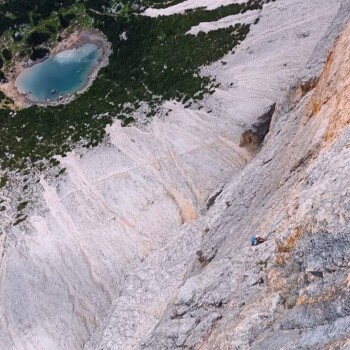 Capanna alpina, rifugio Scotoni e su verso il Lagazuoi. L’aria è fredda e soffia una leggera brezza. Nonostante tutto sia calmo ed il tempo sia sospeso, io sono preoccupato. Continuo a pensare a quelle zone d’ombra lungo alla via, alle eventuali ritirate, a cosa ci saremmo trovati ad affrontare lungo un traverso non chiaro sia come lunghezza che come difficoltà. Addirittura penso con malinconia che per percorrere questo viaggio abbiamo rinunciato alla festa di fine corso del C.A.I., appuntamento goliardico dai toni allegri e spensierati. Forse questo non è il giusto stato d’animo per scalare ma noi ci avviciniamo a quel muro giallo e pian piano cominciamo a riconoscerne ogni asperità: ecco la prima cengia ad un certo punto interrotta da gialli strapiombi, ecco il pulpito del fachiro a destra, ecco la fessura gialla ed il traverso, ecco la seconda cengia. Mi dico: “sarà lungo la salita che senza vergogna valuterò il mio stato d’animo e ne trarrò conclusioni con Mauretto”. Ci leghiamo in silenzio sotto la fascia di placche nere sulla verticale del pulpito in attesa della verità: come mi sentirò quando comincerò a salire? Mi sono sentito bene. La roccia ancora in ombra è fredda e la sensazione di aderenza di mani e piedi è totale. Sento che dopo le ultime intense settimane di corsi ed allenamenti il recupero muscolare (soprattutto delle gambe) è andato a buon fine. La roccia inoltre è di buonissima qualità, porosa e solida, ricca di asperità (caratteristica che non si può dire sia tipica della parte alta della via). Alla seconda lunghezza tiro dritto per quasi 60 metri sostando su due nostri chiodi (uno dei due è rimasto in loco) e tocca a Mauretto il difficile tiro che ci separa dal diedro/camino del pulpito del fachiro che sarò io a salire. Qui sopra posso contemplare a sinistra l’impressionante parete aperta sopra alla quale dovremo traversare. Riusciremo a riposare lo sguardo senza che si perda nel vuoto? Noto anche due minuscole figure salire lungo la vicina Lacedelli. Saliamo ancora senza via obbligata, accettiamo l’invito della roccia seguendo infine un canale nerastro ed appoggiato che ci porta proprio al principio della misteriosa e lunga traversata. Ci fermiamo un istante. Qui cominciano le difficoltà! Questo è il nostro checkpoint, isolotto felice perpendicolare ad un mare giallo e verticale. Ci riposiamo un momento mentre guardiamo la sottile cengia che diventa cornice e si perde nella parete. E’ laggiù che pare Cozzolino abbia tirato dritto ad un certo punto: inconcepibile. Di lì a poco avremmo constatato non solo l’intuito ma anche la tempra di un uomo fuori dall’ordinario. Mauretto comincia a muoversi lungo la cornice e salta due incomprensibili soste: mi consola che voglia continuare ed evitare un secondo tiro in traverso di una lunghezza spropositata. Ad un certo punto comincia a salire e non certo con una ferrea convinzione. Dice di seguire alcuni chiodi e si ferma a leggere una relazione. Ogni tanto sono io, al seguito di un’asola e contro – asola a leggere un altro foglio nella speranza di essere illuminato. Ecco che perso dietro allo spigolo mi dice di aver trovato qualcosa e comincia a recuperarmi. Ero molto teso mentre arrampicavo e constatavo la difficoltà del tiro (sicuramente di VI grado). Giunto in sosta noto che siamo proprio sopra a dove la prima cengia si interrompe e lo sguardo cade per centinaia di metri sino alla base della parete. Sono molto concentrato e valuto assieme a Mauretto che la sosta sulla quale siamo non è esattamente un bell’ancoraggio: un paio di chiodi accoppiati che pare vadano bene, una clessidra minima ed un nut martellato e orribilmente masticato dentro ad una fessura; più avanti una grigia tabula rasa, nessun chiodo, nessun riferimento. Una relazione che abbiamo in mano fa però riferimento a questa sosta e così, accettando l’inevitabile, comincio a muovermi verso sinistra in netto traverso. E’ difficile e continuo, i movimenti estetici, la roccia buona e l’esposizione grande.ma niente da mettere. Noterò solo il giorno dopo che in quei momenti la mia mente era completamente assorbita dal gesto, tutto il mio mondo si riduceva a movimenti il più solidi e precisi possibile, ad appigli da verificare insistentemente ed appoggi minimi: cadere non era contemplabile. Trovo un buco e ci infilo un friend sul quale non mi ci sarei appeso e proseguo nella speranza di trovare una risposta. Dopo circa 35 metri di distanza da Mauretto noto sotto i piedi a circa 4/5 metri un grosso chiodo e decido di disarrampicare quel difficile tratto per raggiungerlo. Trovo così una sosta, due buoni chiodi vicini a un quarto di lunghezza di un netto diedro giallo fessurato e sguarnito. A destra ecco comparire una fila di chiodi e cordini. Insomma il traverso giusto era decisamente più in basso. Mauretto si trova a circa 40 metri da me, circa 5 metri più in alto e a separarci un solo friend. Il mio compagno pensa subito ad una soluzione. Sarebbe stato impossibile affrontare da secondo quel traverso: tolto il friend, un volo (sia a corda bloccata che con mezzo barcaiolo) sarebbe stato inaccettabile. Arrampica calmo con lo zaino addosso e raggiunge il friend. Lo toglie e torna indietro raggiungendo di nuovo la sosta con nut martellato. A questo punto lo calo su una sola mezza corda di circa 5 metri facendolo raggiungere la mia altezza e facendogli scoprire di trovarsi ora su una linea più accettabile e chiodata. Raccolgo la mezza corda ora slegata dal suo imbrago e comincio a recuperarlo piano. Saggiamente decide, previa valutazione, di “azzerare” i passaggi per evitare un lunghissimo pendolo. Vedendolo prossimo alla sosta sento un’irrefrenabile voglia di afferrarlo con le mani o se non altro di offrirgli una mano per farlo arrivare da me ma ovviamente non serve a nulla: è già arrivato. Siamo provati, stanchi e un po’ scossi. Non se ne parla di tornare indietro e ripercorrere il traverso, la sol