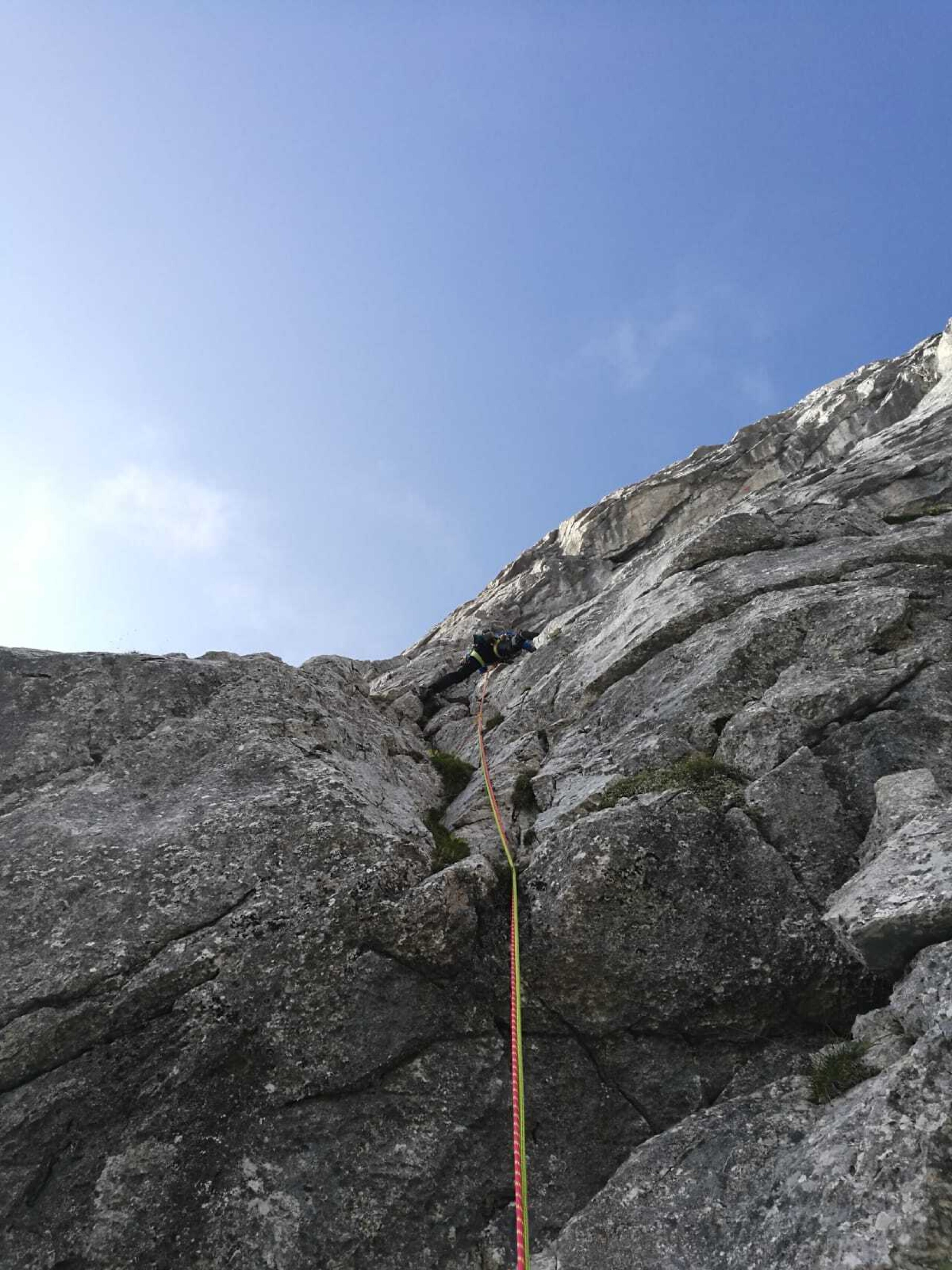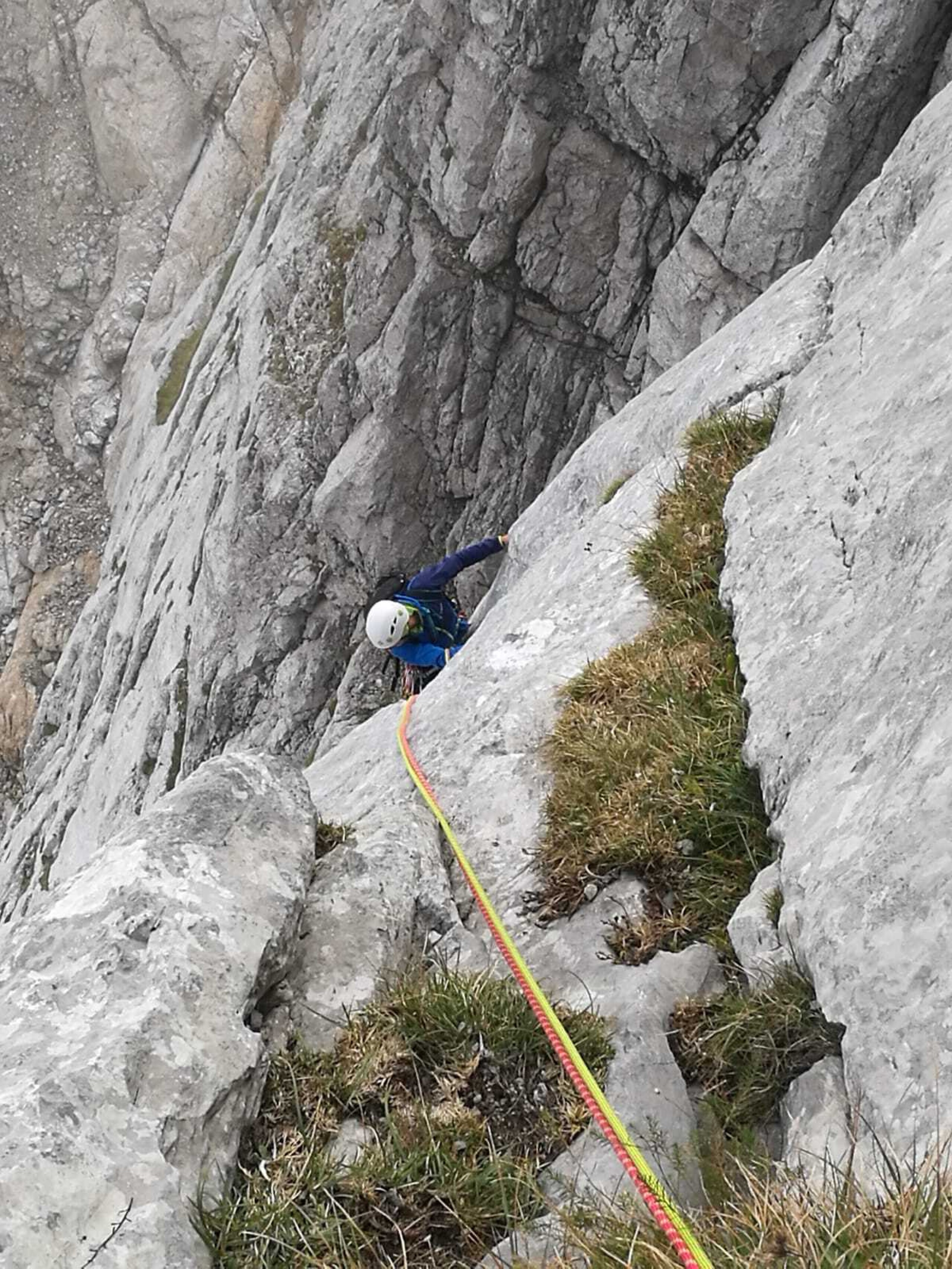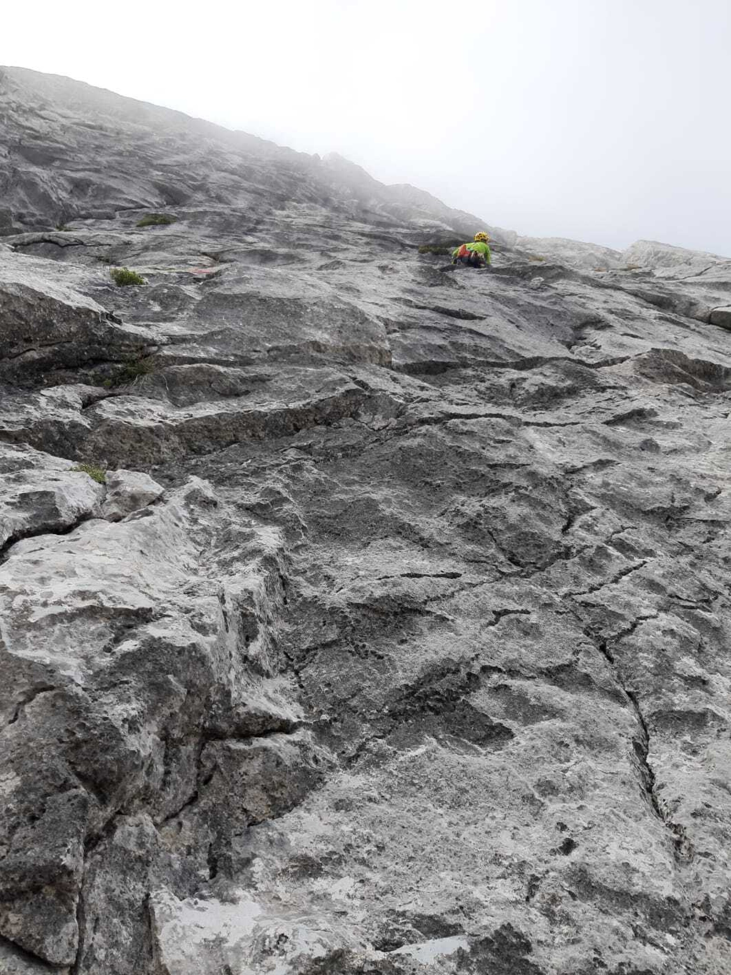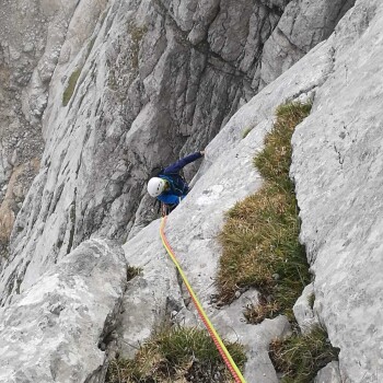 Dodici tiri di corda dalla difficoltà piuttosto sostenuta separano il viaggiatore dall’erbosa e panoramica sommità della montagna. Tutta la via, a parte una quasi certa variante che abbiamo percorso in uscita, è disegnata lungo una placca di qualità eccellente, proteggibile soprattutto a friends vista l’abbondante presenza di fessure. Un particolare che ho notato, ed è una considerazione meramente personale, è che a parte alcuni passaggi esposti non si ha mai la sensazione di trovarsi in piena parete. Non ho sentito la grande esposizione tipica di alcune big walls dolomitiche. Si scala, per così dire, intimamente, su difficoltà costanti che portano da terrazzino in terrazzino in stile classico e con grande estetica tipica dell’arrampicata di VI grado anche superiore. Pernottamento in furgone e la mattina presto si parte! Prima ancora di uscire dal bosco si scorgono le punte lucenti delle montagne che coronano il vallone Winkel: spettacolo garantito, soprattutto al primo sorgere del sole. E’ letteralmente mozzafiato veder comparire le montagne che la notte si nascondevano tra le alte fronde degli alberi. Per spiegare meglio questa sensazione si pensi allo spettacolo che offre la val Saisera appena usciti dall’autostrada: dopo ore di viaggio in mezzo a colline erbose, pareti dall’aspetto friabile e vegetazione di bassa quota, si gira l’angolo ed ecco comparire montagne gigantesche, maestose, lucenti. e non si può far a meno di domandarsi dove fossero nascoste! Ci incamminiamo verso la lontana forcella Winkel per poi abbandonare il sentiero in direzione della grande parete nord-est del Cavallo. Individuiamo visivamente l’attacco e saliamo senza via obbligata fin sotto parete. Sopra di noi, una cordata veneta sta intraprendendo lo stesso viaggio: questa coppia di Schio si rivelerà agile, silenziosa e di piacevole compagnia in quei terrazzini dove l’abbiamo incrociata. Parte Cup che supera una bella fessura di V, in condivisione con la vicina via Guerrino - di Marco, virando poi a destra per sostare sotto un evidente diedro. Il terzo tiro è piuttosto sostenuto con breve e delicato passaggio di VI all’inizio. La medesima difficoltà la si riscontra nella lunghezza successiva, lunghezza resa peculiare da una prima “dis-arrampicata” non banale e successiva traversata esposta fino alla vista del primo di 3 chiodi su placca compatta e tecnica. Il successivo tiro chiave, tutto per Cup, è una lunga e stupenda traversata ad arco su roccia molto compatta e di impossibile proteggibilità: è uno spit al centro del tiro che consente una scalata sicura. Si esce su un atletico VI grado protetto da alcuni chiodi. Da non sottovalutare il successivo V+ che porta alla vista dell’enorme strapiombo che solca la parete. Da qui ci si muove senza via obbligata verso il margine sinistro dello strapiombo cercando una serie di pilastrini presso i quali sostare per poi affrontare il secondo passaggio chiave. Come si può intuire, quando ci si muove senza via obbligata richiede il dover sostare utilizzando i propri mezzi. Nonostante la maggior parte dei ripetitori da me contattati non abbia usato chiodi, io ne ho portati comunque un paio e, provvidenzialmente, di lì a poco sarebbero stati necessari per approntare una sosta sicura proprio in prossimità della cima. Il secondo passaggio di VII- è, secondo me, piuttosto corto e non dà grossi problemi. Una volta eseguito un breve ma duro movimento sprotetto subito sopra la sosta, ci si rinvia su un bel chiodo per poi affrontare una sana fessura. Reputo questa la più bella sezione dell’intera salita: un V grado lungo il quale sia io che Cup abbiamo scalato, vista la scarsità di appoggi, di grande incastro di piedi, in stile “americano”, sino all’abbattimento della parete. Da questo punto credo abbiamo percorso una variante. Mi sono spostato troppo a sinistra rincorrendo la cordata sopra di noi e ho sostato su un singolo chiodo integrato con friend alla base di una sezione di roccia gialla e verticale. Speravo Cup riuscisse ad uscire definitivamente dalla via partendo da quel punto ma effettivamente la cosa sarebbe stata impossibile per chiunque avesse voluto proteggersi adeguatamente. Lo vedo così sostare su friends a metà dell’ultimo salto: avremmo dimezzato questo ultimo e non esaltante tiro. Se il primo passaggio si potrebbe considerare attorno al VI, alla seconda parte del tiro non riuscivo a dare un grado concentrato com’ero ad uscirne. Credo di esserci stato un’eternità, tra il tastare appigli e cercare disperatamente sane asperità dove proteggermi. Esco su una lunga colata rocciosa ed erbosa che nasconde il sole cercando il primo punto adeguato per sostare, cosa non semplice vista la roccia detritica. Scovo un sistema di fenditure dal quale sporadicamente escono ciuffi d’erba e pianto il primo chiodo che entra con un canto glorioso. Appena comincio a battere il secondo ecco che, probabilmente arriciatasi la punta della lama, questo schizza fuori con vigore e rimbalza a circa 5 metri da me. Esasperato e con un attrito indicibile sulle corde, dopo essermi protetto sul chiodo comincio a traversare terrorizzato quel mare di pietrisco recuperando poi l’attrezzo. Tiro su Cup sulla mia sosta approntata e questo, una volta arrivato, parte subito in direzione della cresta sommitale dalla quale mi recupera agilmente.