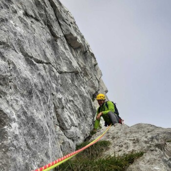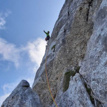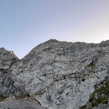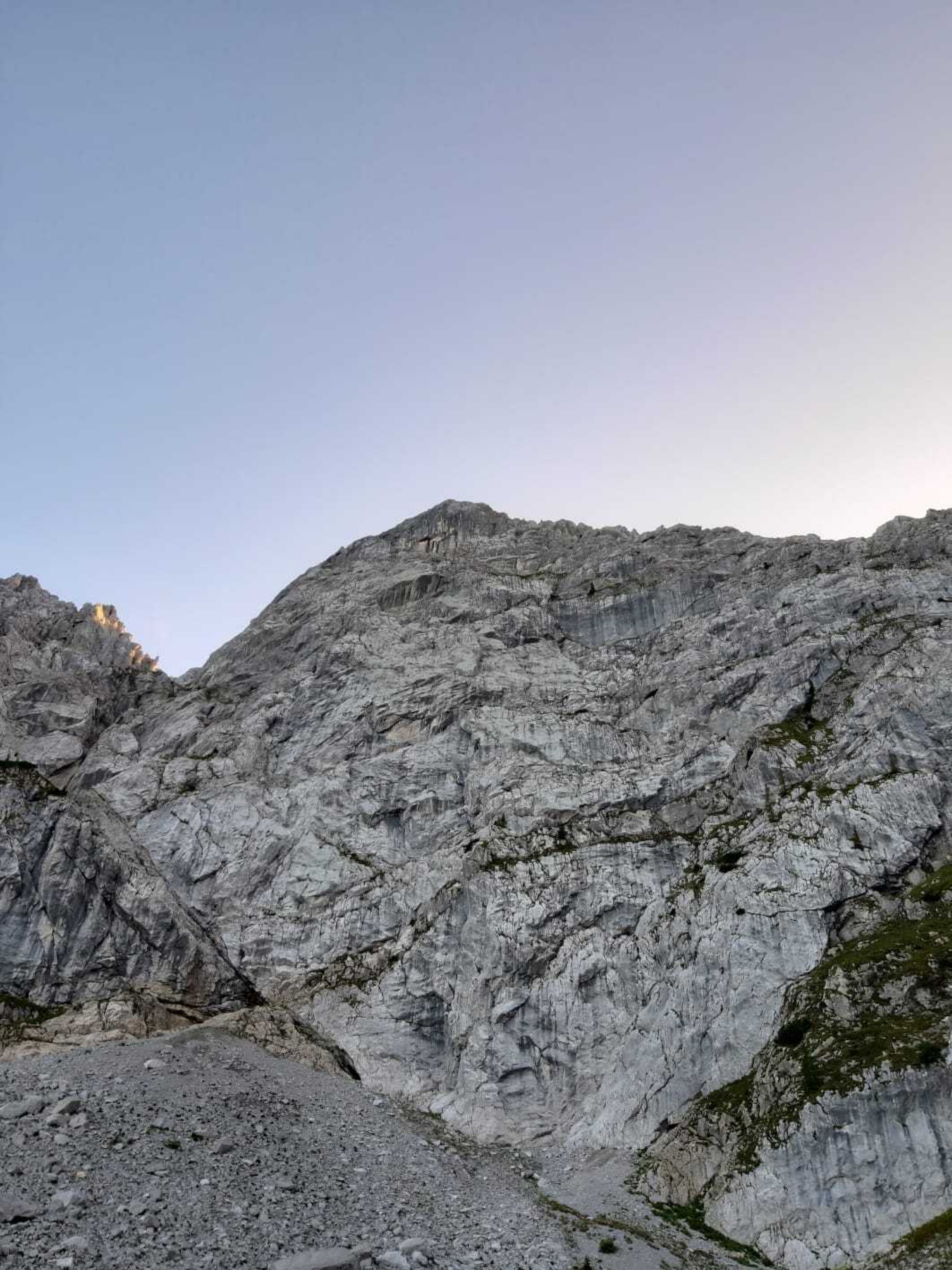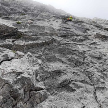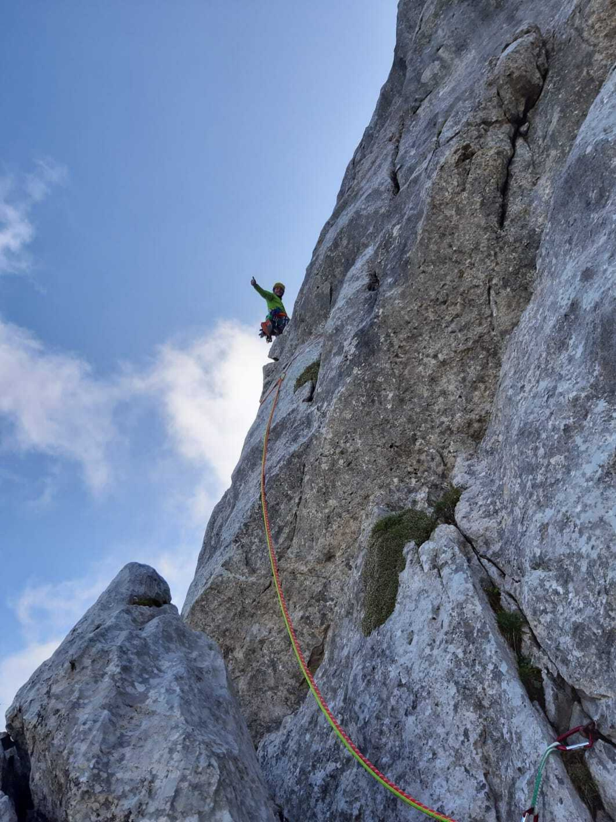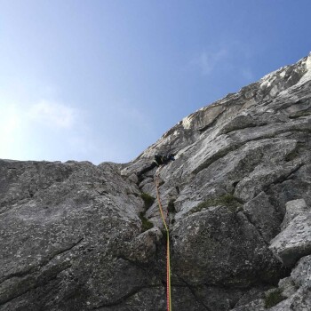 Dodici tiri di corda dalla difficoltà piuttosto sostenuta separano il viaggiatore dall’erbosa e panoramica sommità della montagna. Tutta la via, a parte una quasi certa variante che abbiamo percorso in uscita, è disegnata lungo una placca di qualità eccellente, proteggibile soprattutto a friends vista l’abbondante presenza di fessure. Un particolare che ho notato, ed è una considerazione meramente personale, è che a parte alcuni passaggi esposti non si ha mai la sensazione di trovarsi in piena parete. Non ho sentito la grande esposizione tipica di alcune big walls dolomitiche. Si scala, per così dire, intimamente, su difficoltà costanti che portano da terrazzino in terrazzino in stile classico e con grande estetica tipica dell’arrampicata di VI grado anche superiore. Pernottamento in furgone e la mattina presto si parte! Prima ancora di uscire dal bosco si scorgono le punte lucenti delle montagne che coronano il vallone Winkel: spettacolo garantito, soprattutto al primo sorgere del sole. E’ letteralmente mozzafiato veder comparire le montagne che la notte si nascondevano tra le alte fronde degli alberi. Per spiegare meglio questa sensazione si pensi allo spettacolo che offre la val Saisera appena usciti dall’autostrada: dopo ore di viaggio in mezzo a colline erbose, pareti dall’aspetto friabile e vegetazione di bassa quota, si gira l’angolo ed ecco comparire montagne gigantesche, maestose, lucenti. e non si può far a meno di domandarsi dove fossero nascoste! Ci incamminiamo verso la lontana forcella Winkel per poi abbandonare il sentiero in direzione della grande parete nord-est del Cavallo. Individuiamo visivamente l’attacco e saliamo senza via obbligata fin sotto parete. Sopra di noi, una cordata veneta sta intraprendendo lo stesso viaggio: questa coppia di Schio si rivelerà agile, silenziosa e di piacevole compagnia in quei terrazzini dove l’abbiamo incrociata. Parte Cup che supera una bella fessura di V, in condivisione con la vicina via Guerrino - di Marco, virando poi a destra per sostare sotto un evidente diedro. Il terzo tiro è piuttosto sostenuto con breve e delicato passaggio di VI all’inizio. La medesima difficoltà la si riscontra nella lunghezza successiva, lunghezza resa peculiare da una prima “dis-arrampicata” non banale e successiva traversata esposta fino alla vista del primo di 3 chiodi su placca compatta e tecnica. Il successivo tiro chiave, tutto per Cup, è una lunga e stupenda traversata ad arco su roccia molto compatta e di impossibile proteggibilità: è uno spit al centro del tiro che consente una scalata sicura. Si esce su un atletico VI grado protetto da alcuni chiodi. Da non sottovalutare il successivo V+ che porta alla vista dell’enorme strapiombo che solca la parete. Da qui ci si muove senza via obbligata verso il margine sinistro dello strapiombo cercando una serie di pilastrini presso i quali sostare per poi affrontare il secondo passaggio chiave. Come si può intuire, quando ci si muove senza via obbligata richiede il dover sostare utilizzando i propri mezzi. Nonostante la maggior parte dei ripetitori da me contattati non abbia usato chiodi, io ne ho portati comunque un paio e, provvidenzialmente, di lì a poco sarebbero stati necessari per approntare una sosta sicura proprio in prossimità della cima. Il secondo passaggio di VII- è, secondo me, piuttosto corto e non dà grossi problemi. Una volta eseguito un breve ma duro movimento sprotetto subito sopra la sosta, ci si rinvia su un bel chiodo per poi affrontare una sana fessura. Reputo questa la più bella sezione dell’intera salita: un V grado lungo il quale sia io che Cup abbiamo scalato, vista la scarsità di appoggi, di grande incastro di piedi, in stile “americano”, sino all’abbattimento della parete. Da questo punto credo abbiamo percorso una variante. Mi sono spostato troppo a sinistra rincorrendo la cordata sopra di noi e ho sostato su un singolo chiodo integrato con friend alla base di una sezione di roccia gialla e verticale. Speravo Cup riuscisse ad uscire definitivamente dalla via partendo da quel punto ma effettivamente la cosa sarebbe stata impossibile per chiunque avesse voluto proteggersi adeguatamente. Lo vedo così sostare su friends a metà dell’ultimo salto: avremmo dimezzato questo ultimo e non esaltante tiro. Se il primo passaggio si potrebbe considerare attorno al VI, alla seconda parte del tiro non riuscivo a dare un grado concentrato com’ero ad uscirne. Credo di esserci stato un’eternità, tra il tastare appigli e cercare disperatamente sane asperità dove proteggermi. Esco su una lunga colata rocciosa ed erbosa che nasconde il sole cercando il primo punto adeguato per sostare, cosa non semplice vista la roccia detritica. Scovo un sistema di fenditure dal quale sporadicamente escono ciuffi d’erba e pianto il primo chiodo che entra con un canto glorioso. Appena comincio a battere il secondo ecco che, probabilmente arriciatasi la punta della lama, questo schizza fuori con vigore e rimbalza a circa 5 metri da me. Esasperato e con un attrito indicibile sulle corde, dopo essermi protetto sul chiodo comincio a traversare terrorizzato quel mare di pietrisco recuperando poi l’attrezzo. Tiro su Cup sulla mia sosta approntata e questo, una volta arrivato, parte subito in direzione della cresta sommitale dalla quale mi recupera agilmente.