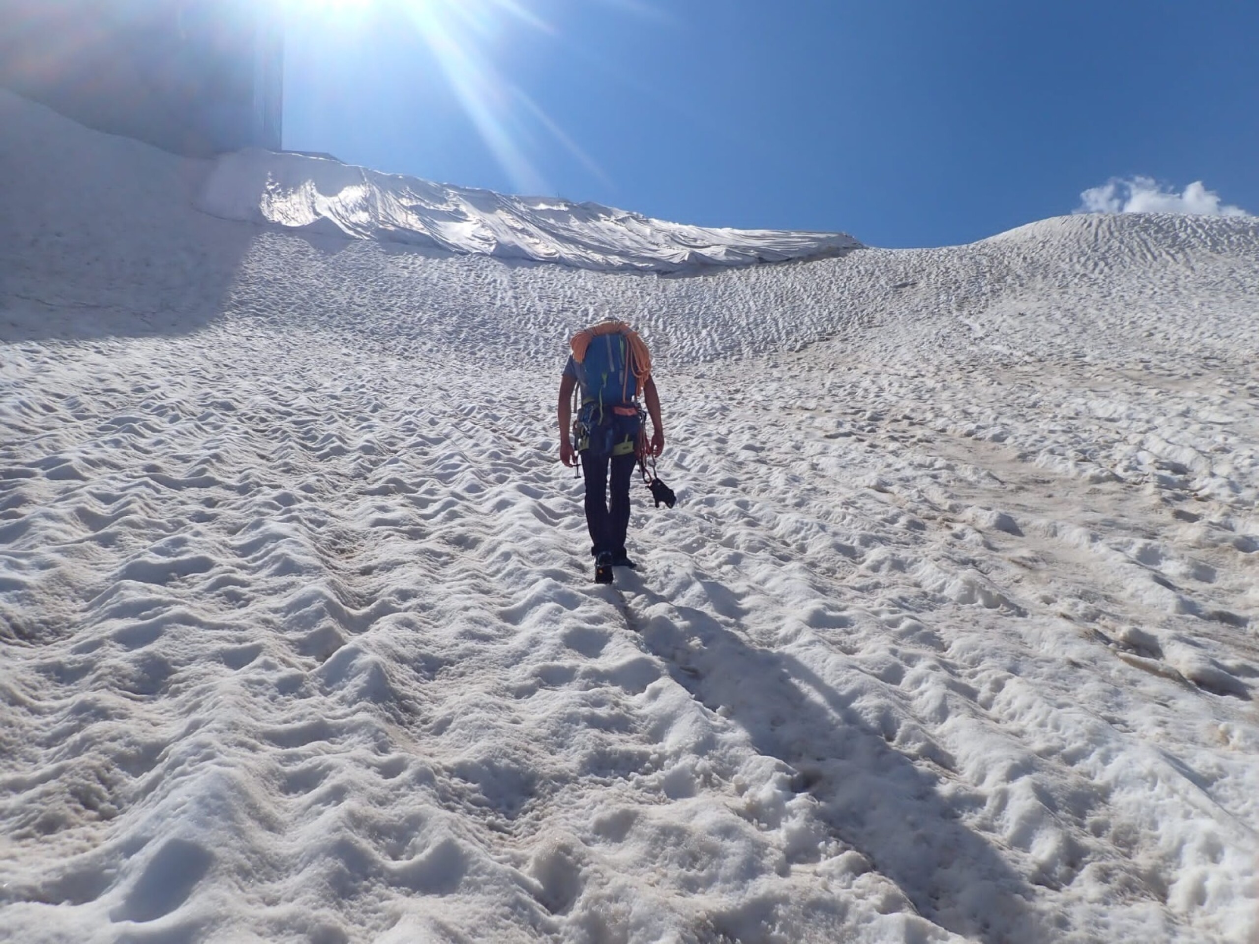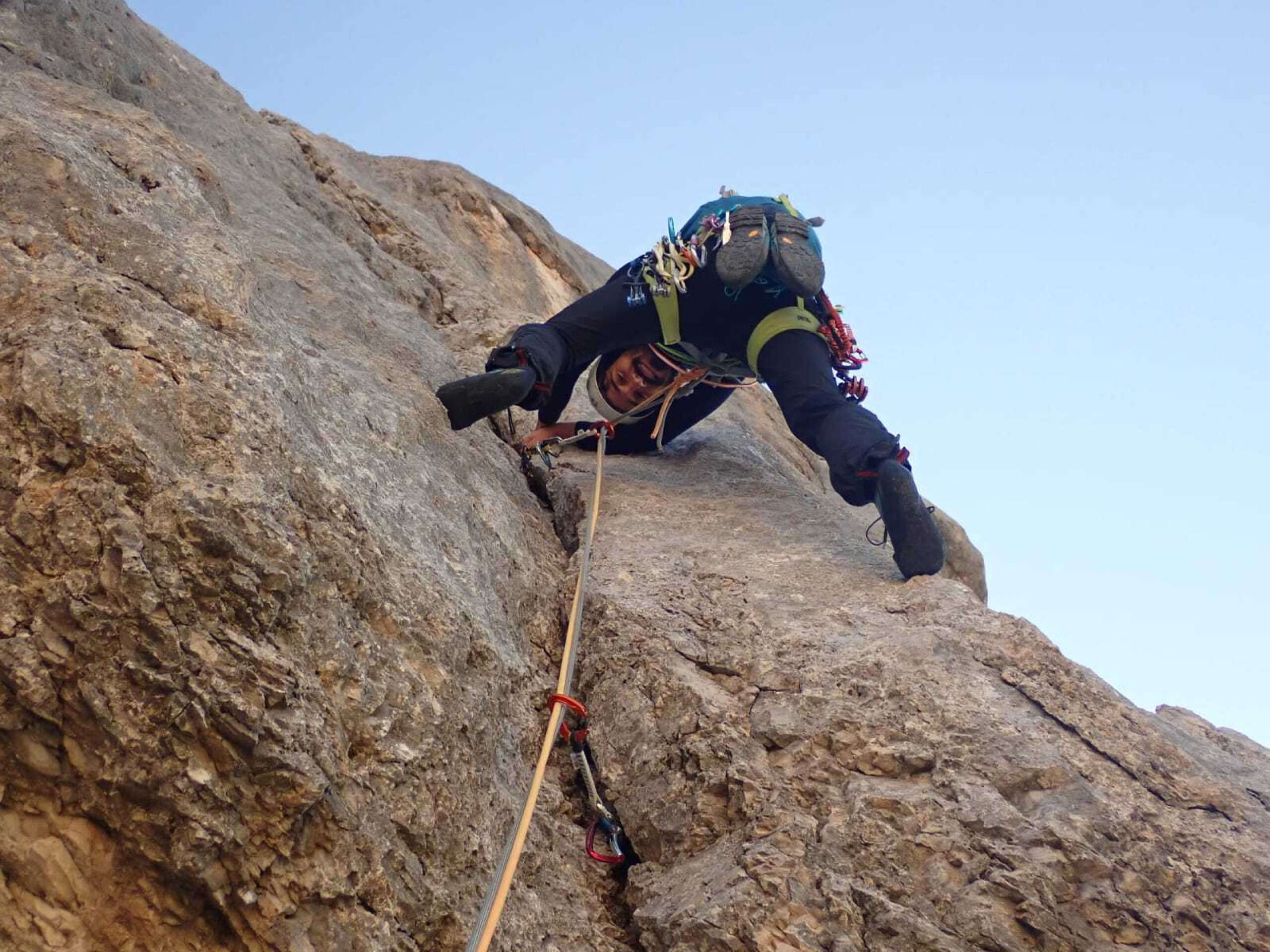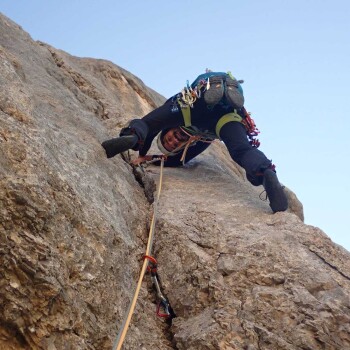 Ci svegliamo alle 4.00 del mattino e facciamo colazione in cambusa assieme a tutte le cordate. Siamo forse gli ultimi ad uscire alle 4.30 ed ecco le prime difficoltà: qualcuno ha scambiato le scarpe di Euge con le proprie. Euge si ritrova con il suo stesso modello di scarpe d’avvicinamento ma ben di 2 numeri in meno. Siamo furibondi e frustrati. Cominciamo una corsa vigorosa in direzione delle torce più in alto nella speranza di raggiungere i ragazzi e chiedere loro informazioni ma questi sono ormai irraggiungibili e decidiamo così di rinunciare. Secondo problema: la corsa sfrenata ci ha fatto praticamente perdere al buio e, trovato l’attacco, abbiamo davanti una bella coda di alpinisti. Sono tutti estremamente cordiali e riposati, noi invece sudati dalla testa ai piedi e molto nervosi. Quando cominciamo ad arrampicare però l’umore cambia. Evitiamo la strategia di molte cordate di fare le prime lunghezze in conserva e sono fiero del fatto che assieme scivoliamo bene sulla roccia e riusciamo addirittura a superare Tom e Will che si muovevano proprio utilizzando la conserva. Non li avremmo più visti, nemmeno dal pilastro della parte superiore della via: è probabile si siano ritirati.