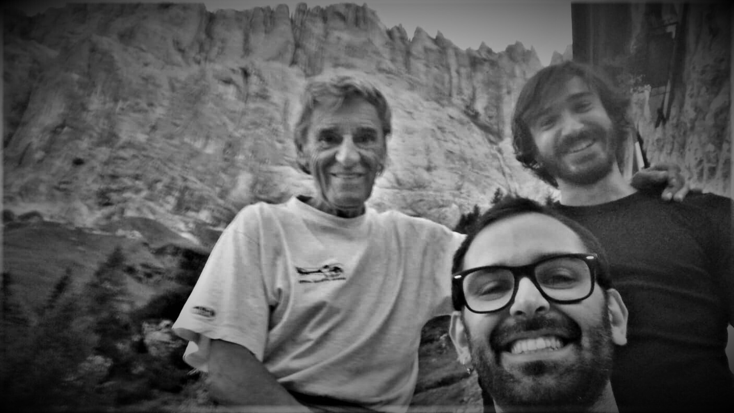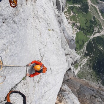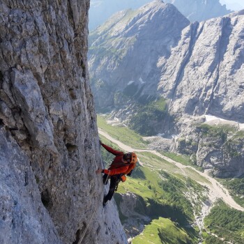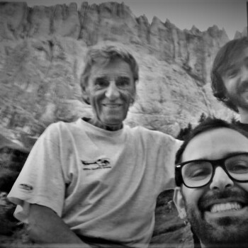 Ad ogni modo, la Don Quixote è una via dai numerosi passaggi di sesto grado ed il tiro chiave, variante non originale, è di sesto superiore o A0 (ho sentito dire che sia una variante del grande Alessandro Gogna ma potrei sbagliarmi). Quando Mariacher in una giornata nuvolosa stava per ripetere la Vinatzer assieme alla sua compagna Iovane e Schiestl, notò ad un certo punto il pilastro sopra la cengia mediana liberarsi dalle nuvole. Così, con l’uso ridottissimo di chiodi decise di attaccare la parete ed aprire questo capolavoro manco fosse un bimbo che si diverte al parco giochi. Qualche anno dopo la ripeterà in solitaria.