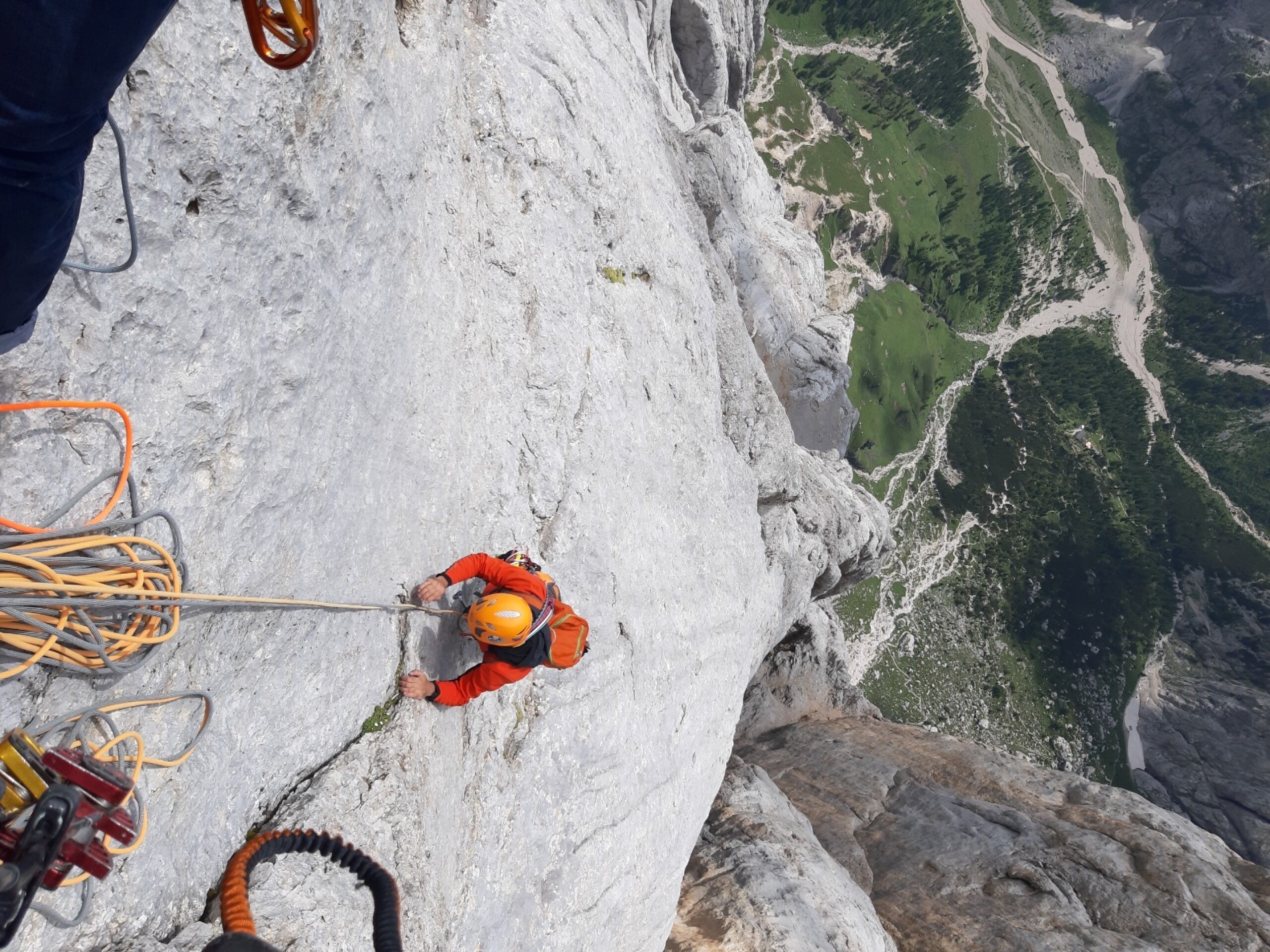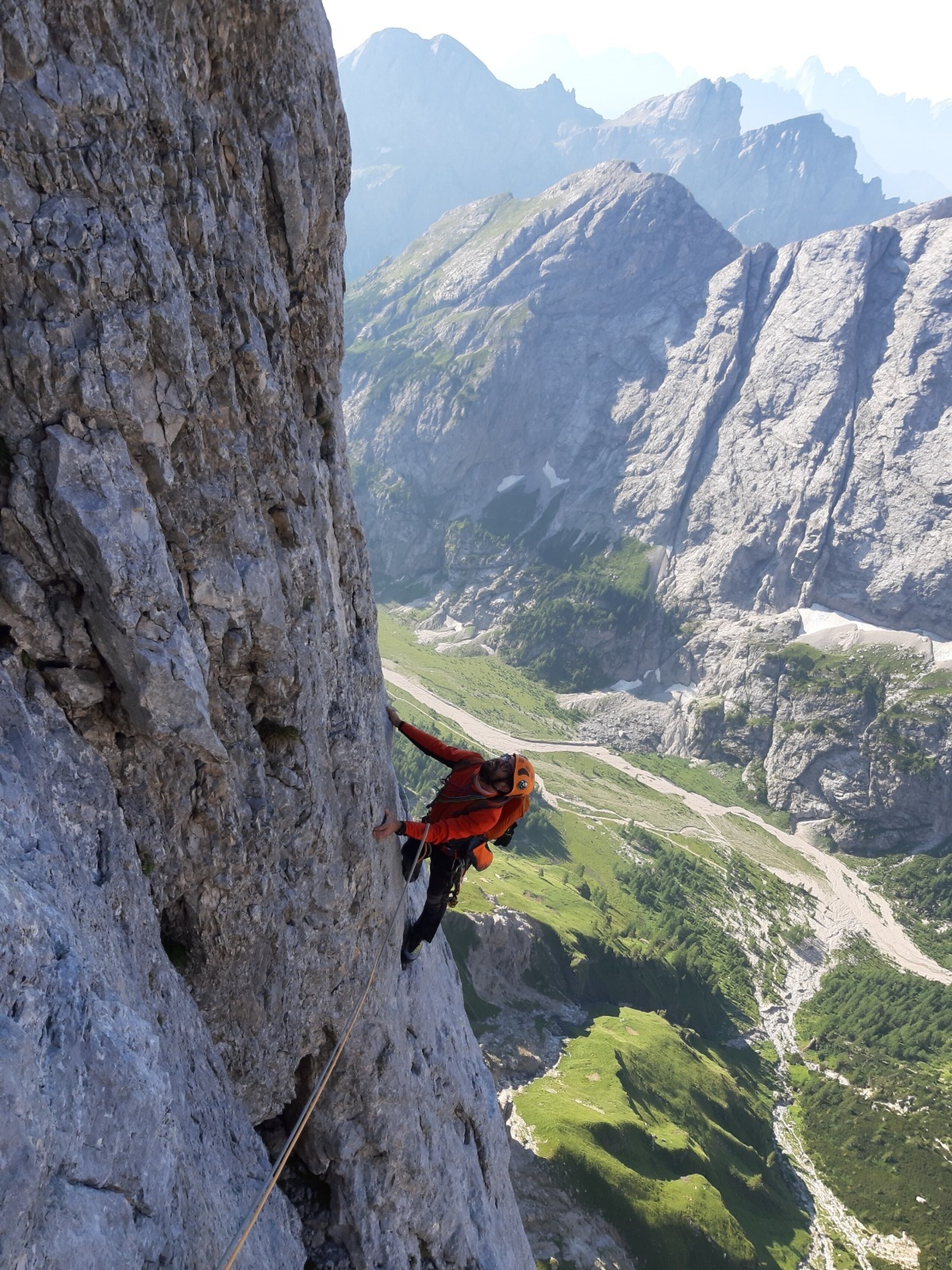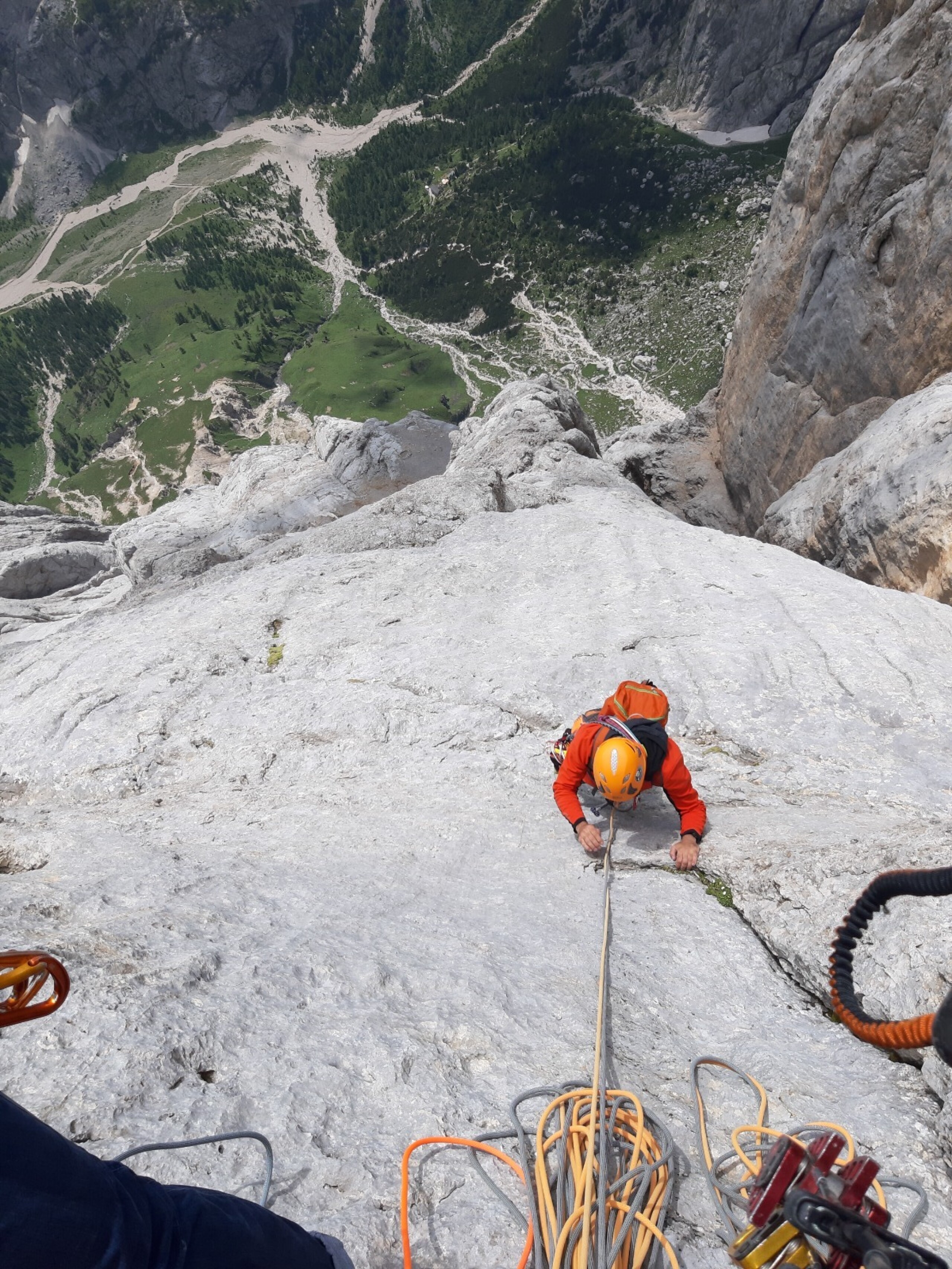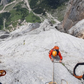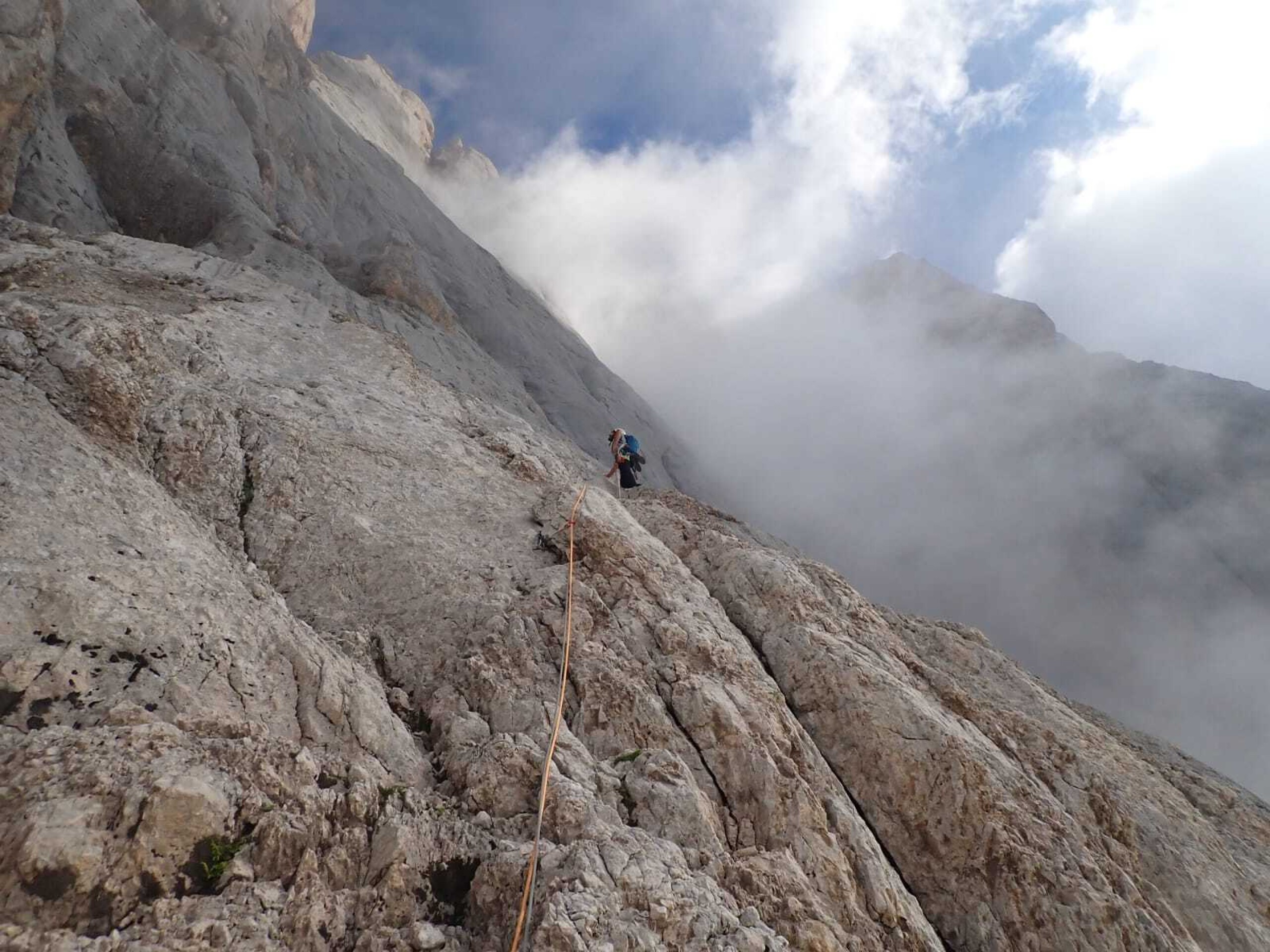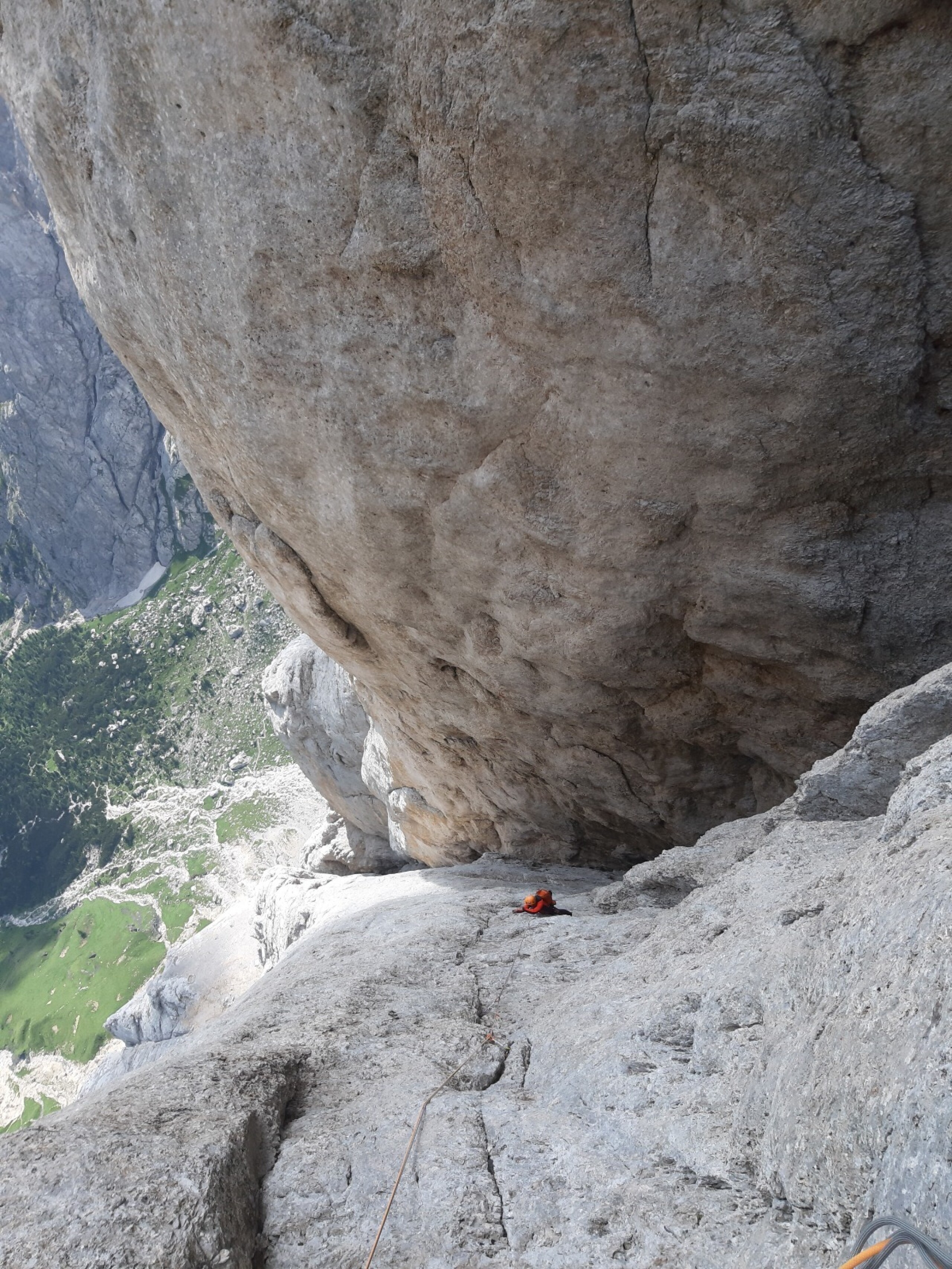 La prima parte della salita, ovvero quella fino alla grande cengia mediana, è scorrevole ma presenta alcune sporadiche difficoltà di V grado con un impegnativo passaggio di VI sul finale; c’è da prestare attenzione alla gran quantità di soste in loco che possono portare a numerose involontarie varianti. Mentre siamo alla vista del gigantesco placcone proprio sotto la cengia mediana possiamo apprezzare l’ambiente della Marmolada veramente, con il suo candore, il suo freddo mattutino e le sue forme. Alla mia sinistra vedo anche la famosa nicchia a forma di pesce della mitica Weg durch den fisch: che emozione!