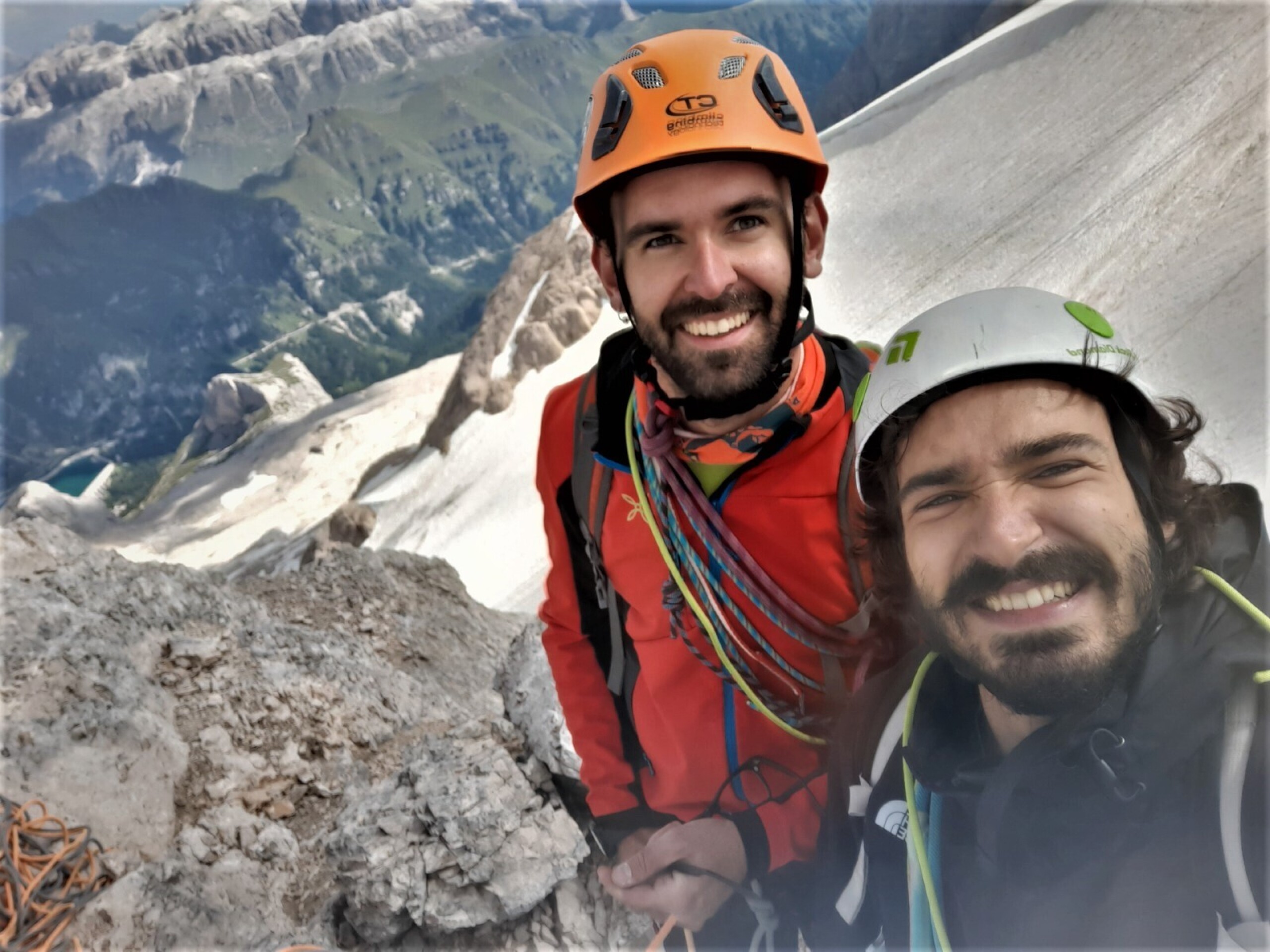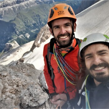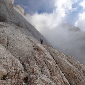 Ben sulla destra della grande placca superiamo il difficile camino con successivo delicato traverso, tiro chiave della prima parte, evitando di affrontare il camino per intero, che ci guarda minaccioso con i suoi cordini penzolanti. Usciamo sulla cengia notando di essere ben in anticipo sulla tabella di marcia, il sole scalda moltissimo e salire all’attacco del pilastro finale sembra più complesso che arrampicare in verticale. La faccenda non è facile e non lo sarà per i prossimi 13 tiri: vedo Euge stanco e lo sono anche io, cosa che dovrebbe giustamente impensierirmi. Appena partiamo e superiamo la “barriera” dei primi tre tiri però, comincia per me un conto alla rovescia mentale che mi porta a puntare verso l’alto più che cercare periodicamente punti di ritirata. Non è solo l’avvicinarsi della cima, e ahimè delle difficoltà, a farmi star bene è l’ambiente straordinario che ci circonda: scaliamo uno scivolo grigio che pare la lingua mastodontica di una divinità. Da non sottovalutare il tiro in strapiombo di V+ in uscita dalla grande nicchia di destra, tiro ben chiodato ma molto fisico. Lunghezza dopo lunghezza veniamo avvicinati da una guida con cliente velocissimi che non appena la salita comincia a farsi più verticale condividono con noi parecchi tiri, un po’ davanti ed un po’ dietro. Quando ci superano definitivamente è la volta del tiro chiave che purtroppo non ho liberato sentendo il penso dello zaino e, devo ammetterlo con stupore, un po’ di rarefazione dell’aria vista la quota. Il meteo muta continuamente: si passa da un freddo minaccioso al tepore del sole, le nuvole si muovono velocissime e spesso ci attraversano rendendo il panorama un denso latte luminoso. Appeso al penultimo tiro tra due grattacieli di pietra aspetto euforico Euge rendendomi conto che ci manchi veramente poco. Sale ora lui su quello che dovrebbe essere l’ultimo tiro e non appena comincia a recuperarmi dall’alto, sento un vento familiare, vento da nord che scavalca punta Ombretta, vento di verticalità che va abbattendosi gradualmente. Ricongiunti ci stringiamo forte in un abbraccio sentito e pieno di ammirazione reciproca: al culmine del nostro viaggio, sopra le fatiche. E quel vento ora soffia forte e freddo dal ghiacciaio, pulisce le nuvole e ci svela il Sassolungo, il Boè, le Tofane, il gruppo di Fanis, una nord del Civetta da poter stringere nel pugno, il Pelmo e l’Antelao. Non resisto e tutti i nodi in gola di questo periodo si sciolgono in un pianto vigoroso che Euge cerca di immortalare con la macchina fotografica in mezzo alle mie risate e tentativi di nascondermi. Mi ripete che è bello io sia così ma io non ci credo molto: quello che credo senza dubbio è di amare da impazzire tutto questo.
