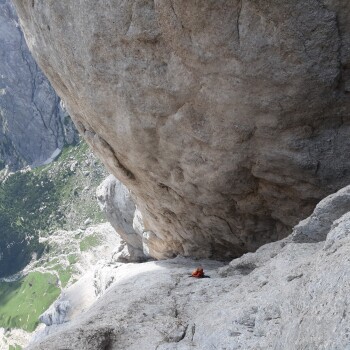 Chiunque percorra la Don Quixote, realizzazione di Heinz Mariacher e Reinhard Schiestl negli anni ‘70, non può che sentirsi anch’egli un cavalleresco alpinista che combatte personali battaglie. Uno sviluppo di circa 900 metri per un totale di 23 lunghezze di corda sono il viaggio che ci separa dalla base a questa panoramica guglia tondeggiante, molto estetica, facente parte della punta Ombretta. Zaini “precisi” in spalla e da località Malga Ciapela partiamo spediti verso il Falier, famoso rifugio messo a disposizione di tutti coloro s’incantino dinnanzi alla parete d’argento. Ci fermiamo spesso a contemplare il muro che va formandosi sopra le nostre teste e i nostri pensieri sono cullati dai campanacci delle mucche. Incrociamo sui prati Tom e Will, i due simpatici inglesi con cui condivideremo cena, dormitorio e prima parte della via. Arrivati affamati al Falier, sia di polenta che della roccia della Marmolada ovviamente, salutiamo un bel gruppo di ragazzi carichi di materiale d’alpinismo e avremmo scoperto di lì a poco quale fosse il loro vertiginoso livello: chi è lì per aprire una nuova via e chi per ripetere linee di prestigio come Bruderliebe del grande Hansjörg Auer. Euge esprime sia il suo entusiasmo per il nostro obiettivo attuale che la convinzione che difficilmente nella nostro percorso d’alpinisti avremmo mai potuto raggiungere quei mostri sacri. Ma questo ha importanza? Ognuno vive la salita più o meno intensamente e ciò che sente lungo la strada sarà sempre qualcosa di interamente suo, intoccabile ed ineguagliabile, come un sogno, sembra quasi una frase di Albus Silente.
