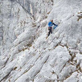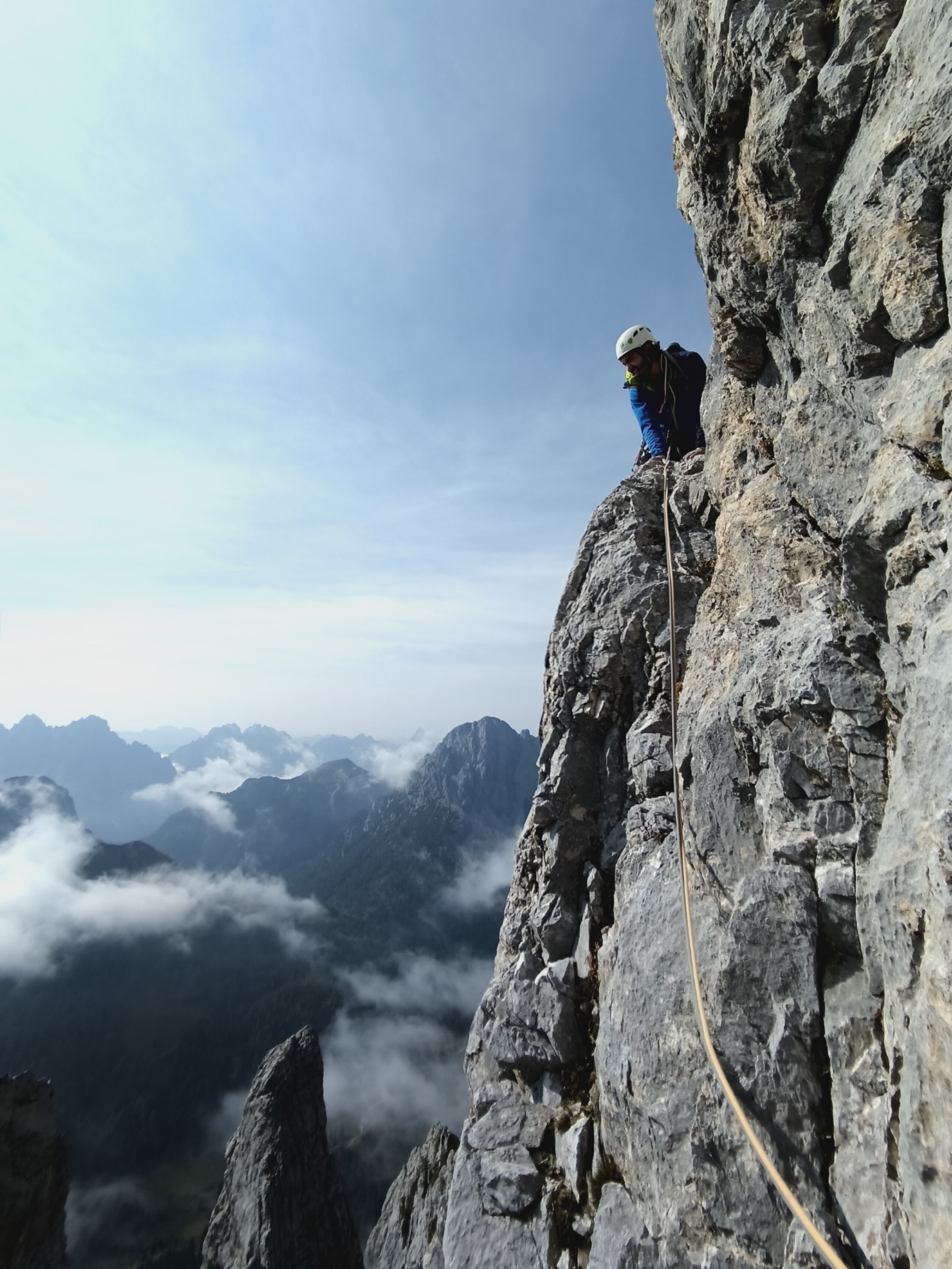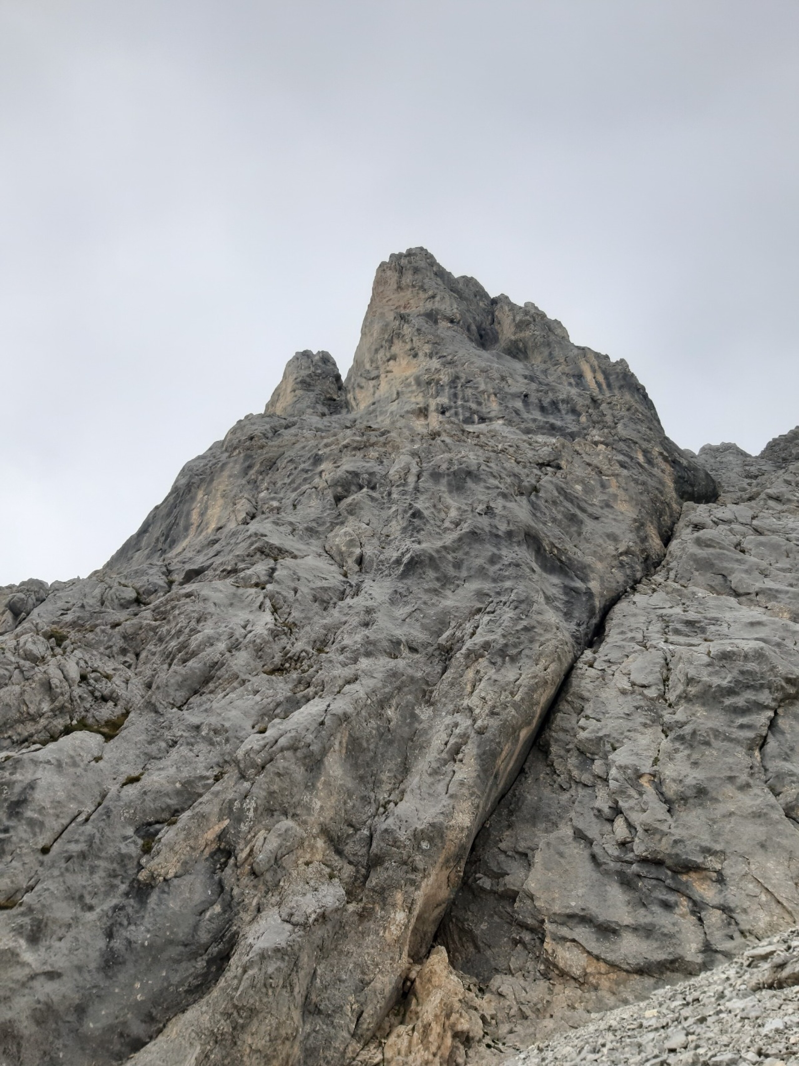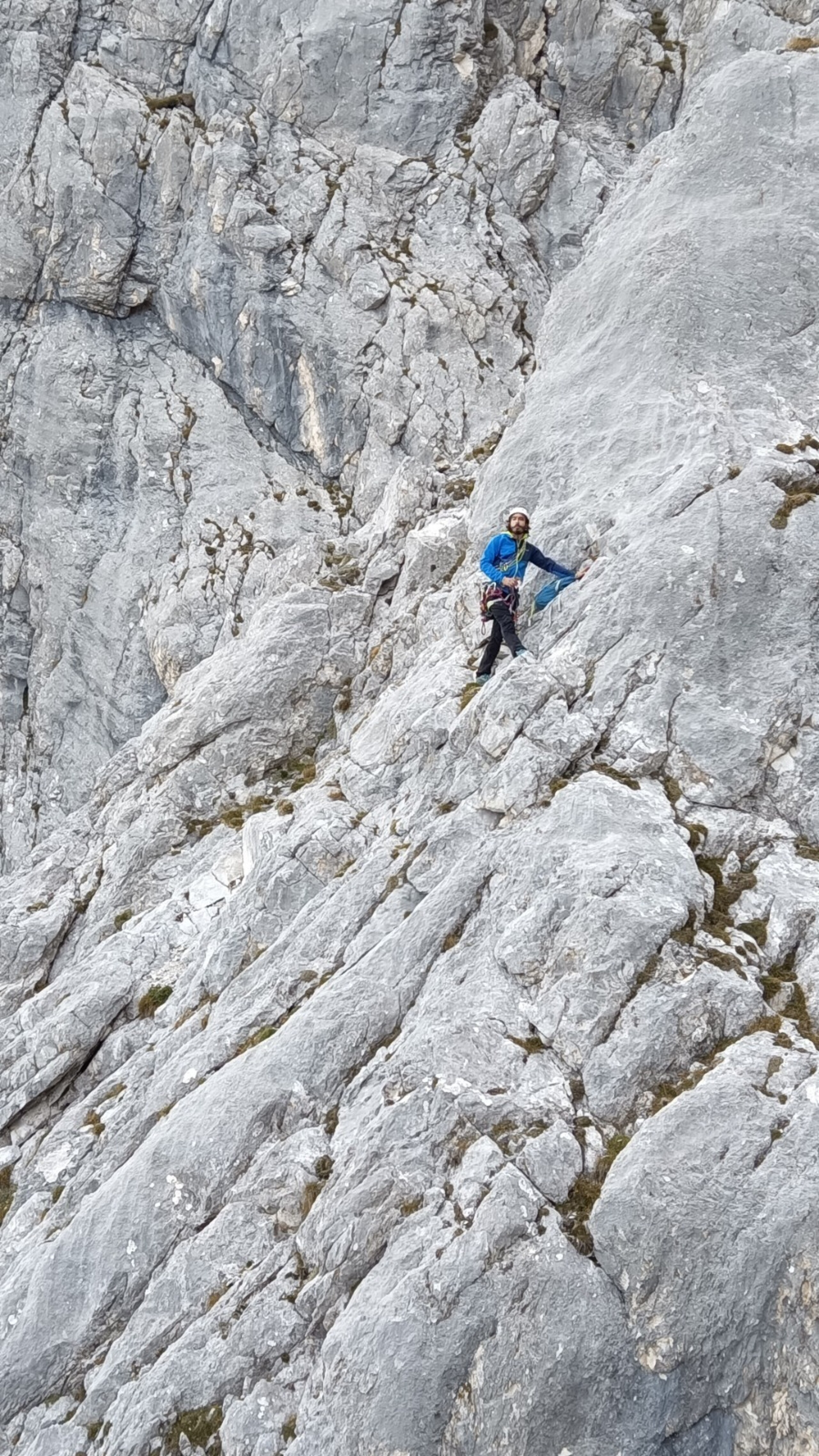 - Come da schizzo (Zorzi-D’Eredità “alpi carniche occidentali, vie classiche e moderne”, Alpine Studio 2018), si percorre il breve passaggio di VI grado ben protetto ed il successivo diedro/camino fessurato. Da qui ci siamo spostati troppo a sinistra assecondando le roccette che, in diagonale da destra a sinistra, portano alla vicina “De Infanti-Dalla Porta Xidias” (2 chiodi di sosta). Compreso di essere probabilmente fuori via, parto io in traverso netto verso destra rinvenendo la scomoda sosta appesa ed esposta su spuntone e chiodo.