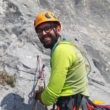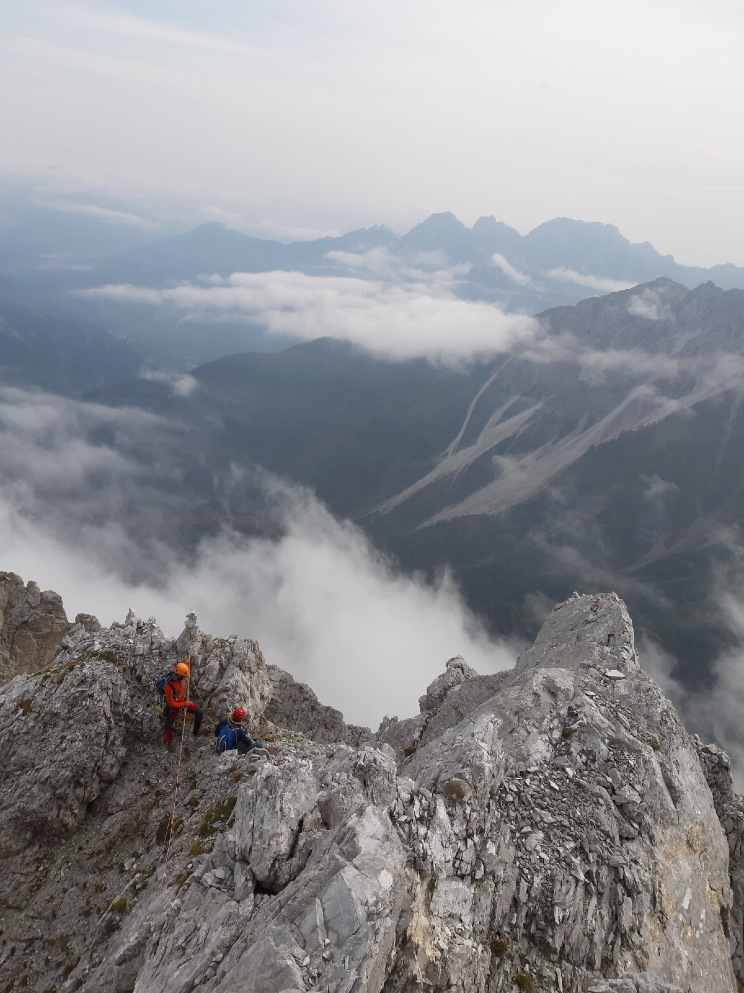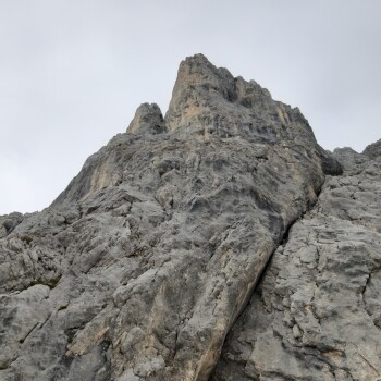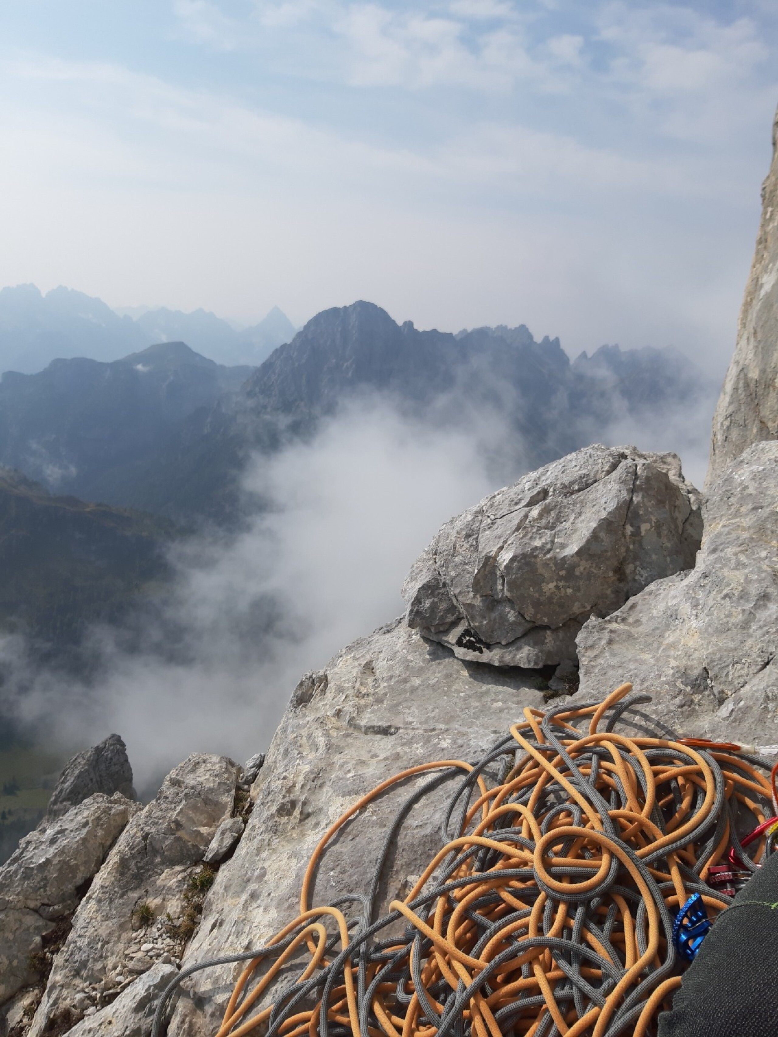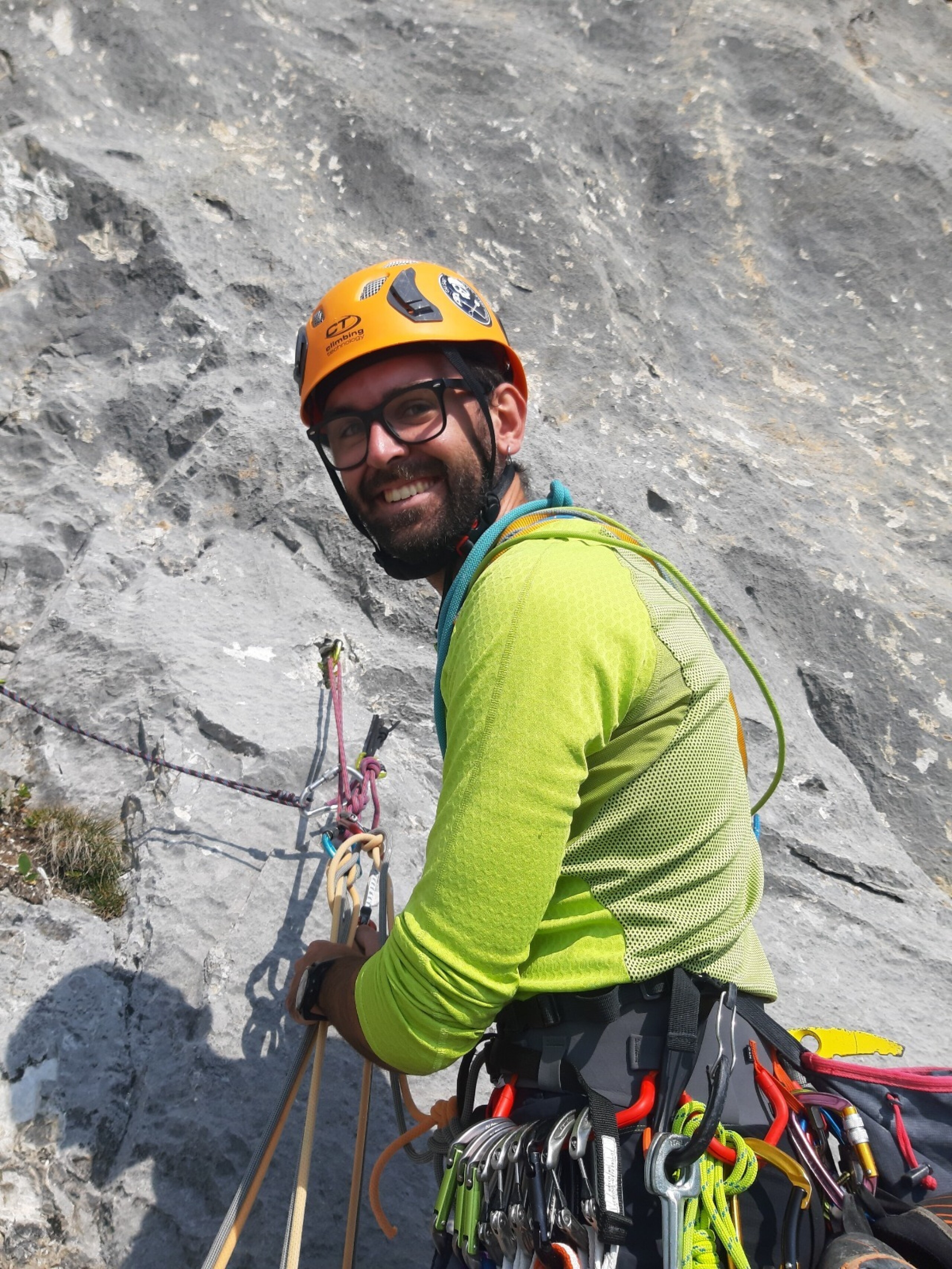 - Come da schizzo (Zorzi-D’Eredità “alpi carniche occidentali, vie classiche e moderne”, Alpine Studio 2018), si percorre il breve passaggio di VI grado ben protetto ed il successivo diedro/camino fessurato. Da qui ci siamo spostati troppo a sinistra assecondando le roccette che, in diagonale da destra a sinistra, portano alla vicina “De Infanti-Dalla Porta Xidias” (2 chiodi di sosta). Compreso di essere probabilmente fuori via, parto io in traverso netto verso destra rinvenendo la scomoda sosta appesa ed esposta su spuntone e chiodo.