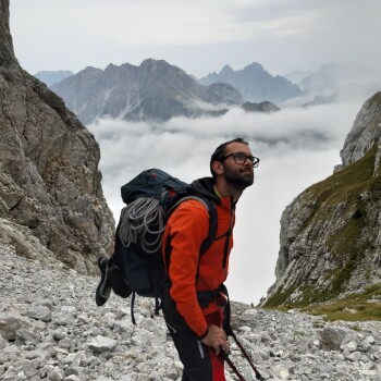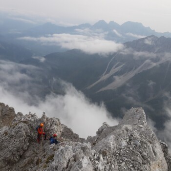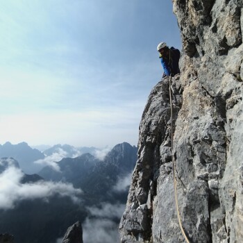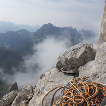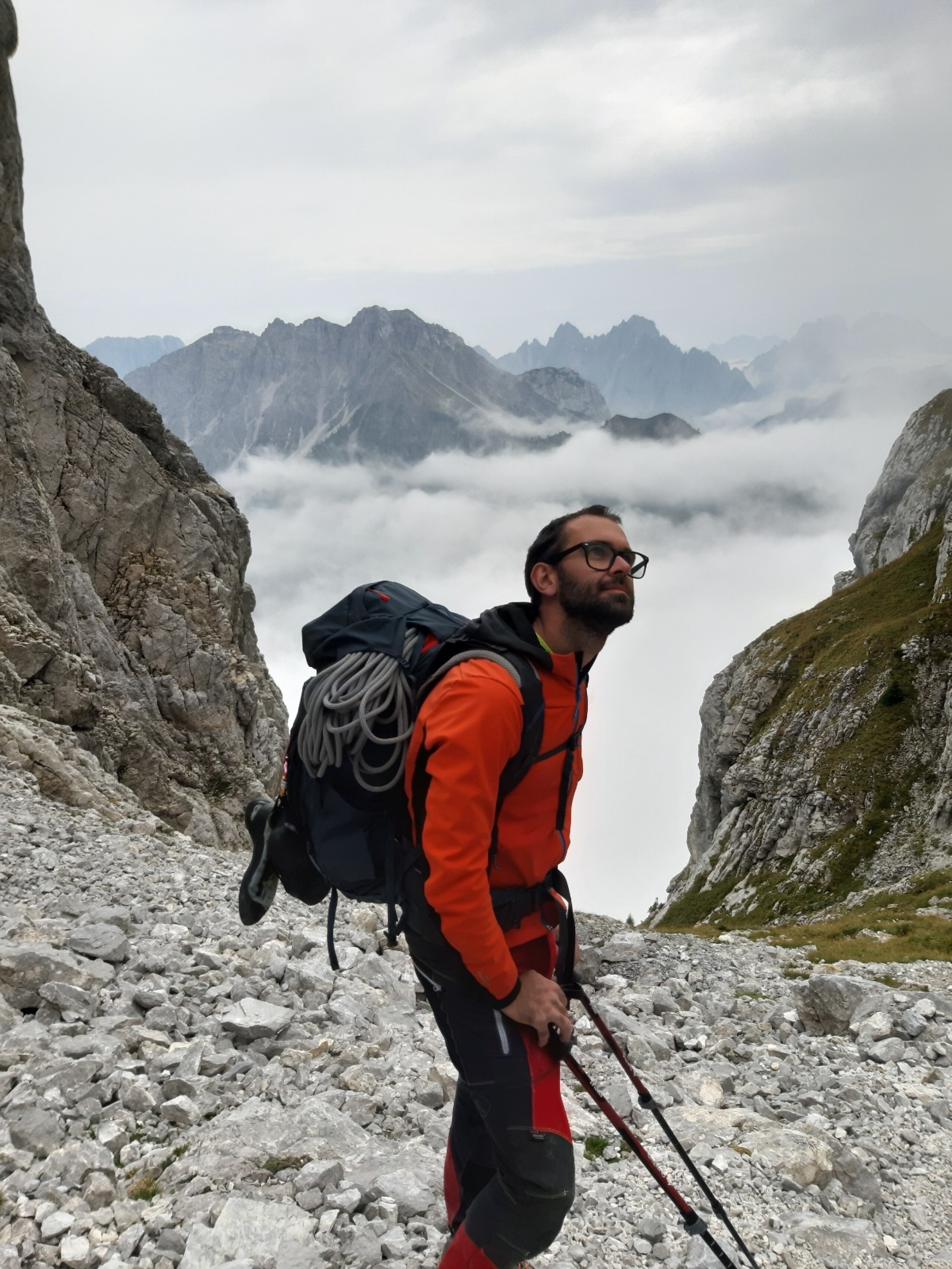 In discesa il cielo si è timidamente coperto. Il sole appariva debole, quasi spento dietro le nuvole, regalandoci un’atmosfera ed una luce decisamente particolari. Non vedo e non percepisco l’influenza umana tra queste montagne e ancora una volta mi ritrovo a pensare a quanto belle siano le Alpi Carniche, selvagge e capaci di regalare scalate di enorme qualità.
