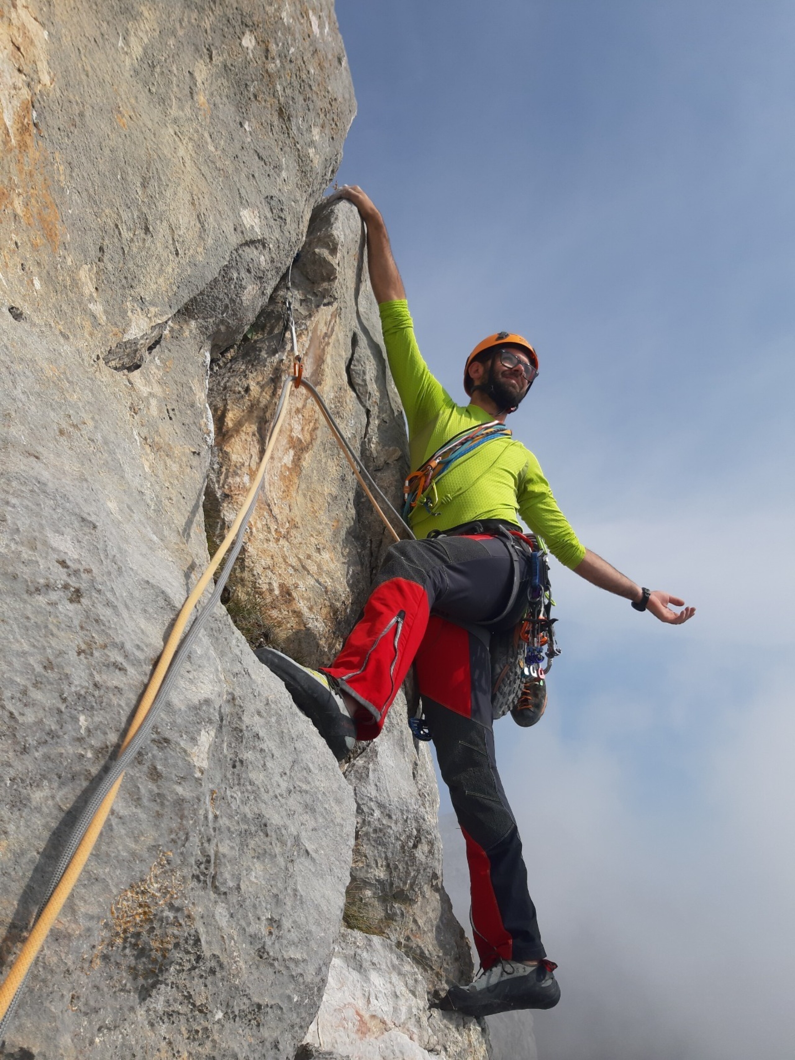 - Tiro “sguarnito” e senza evidente percorso obbligato su roccia non sempre eccellente. Il primo passaggio di VI- (un chiodo) è su ottima roccia. Segue una sezione di arrampicata delicata leggermente verso destra (ma non troppo!). Qui si dovrebbe rinvenire un chiodo da noi posizionato, unica apparente possibilità di protezione. A questo punto, stando una manciata di metri più in basso di scuri strapiombi si arrampica in diagonale verso sinistra per poi entrare in una specie di nicchia detritica con scomoda sosta a terra (2 chiodi).