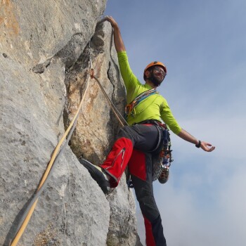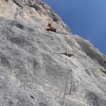 - Il successivo bellissimo ed aereo tiro si svolge su una placca porosa ed invitante. Un passaggio di VI- ben protetto da un chiodo conduce al punto dove la verticalità si abbatte. Senza via obbligatoria si punta alla base dell’evidente tiro chiave con lama e sottostante cordone (una volta fettuccia) pendente.
